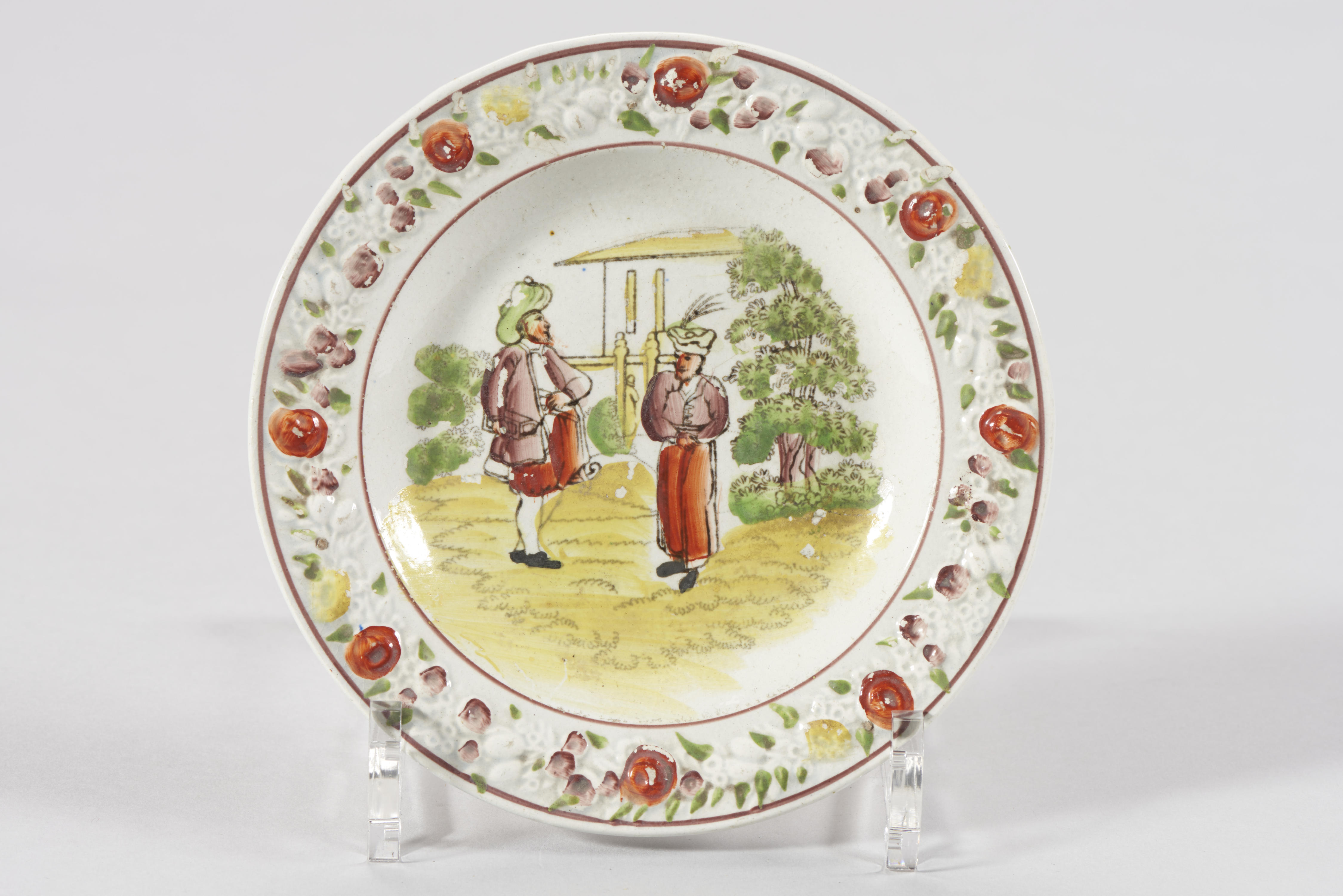 Bord met de voorstelling van twee mannen in een landschap. De rand van het bord is versierd met vrucht- en bladmotieven.