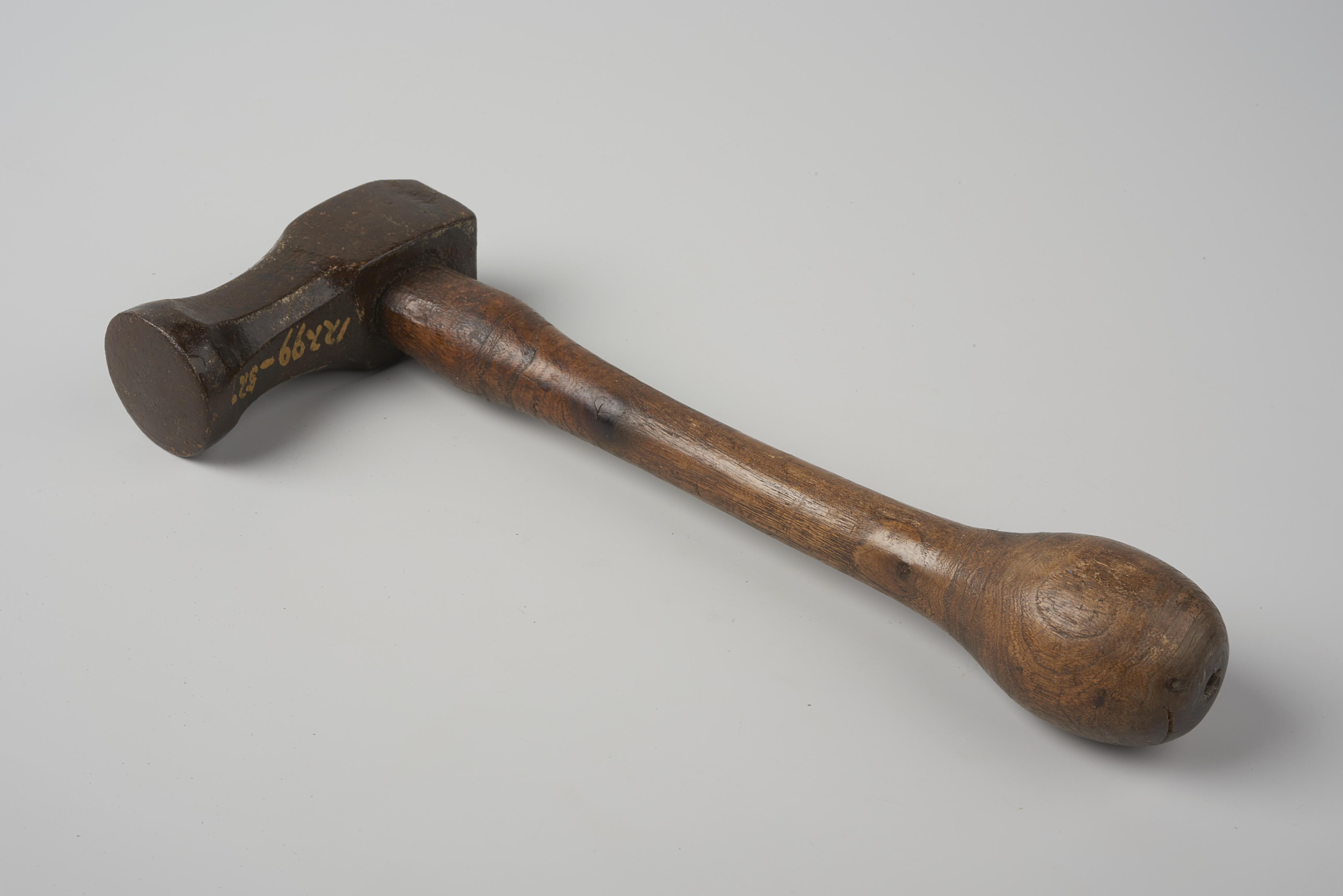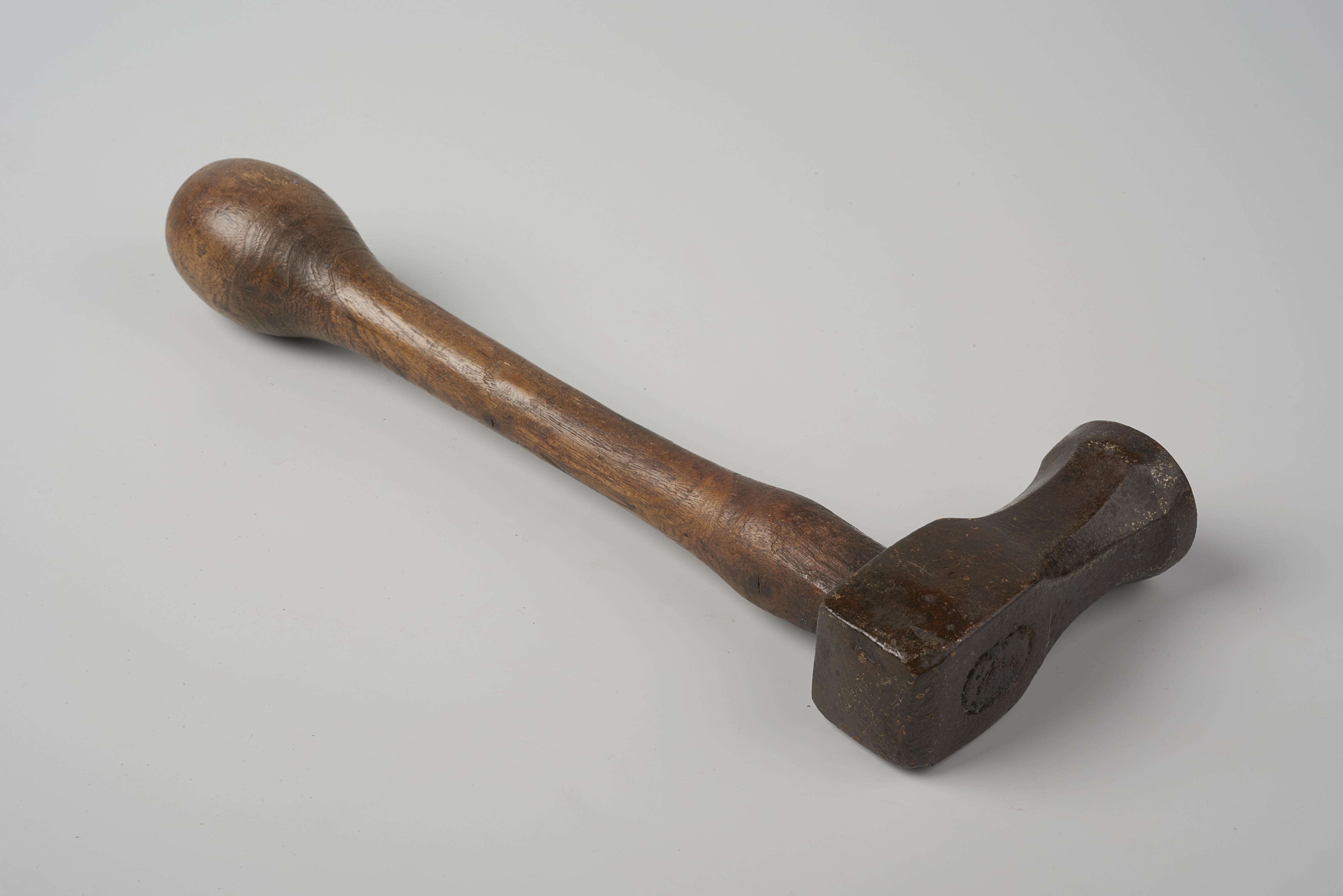 Drijf- en bolhamer, van het type bruineerhamer. De ijzeren hamer met houten steel is gebruikt voor het drijven van metaal en is in gebruik geweest bij een koperslager.