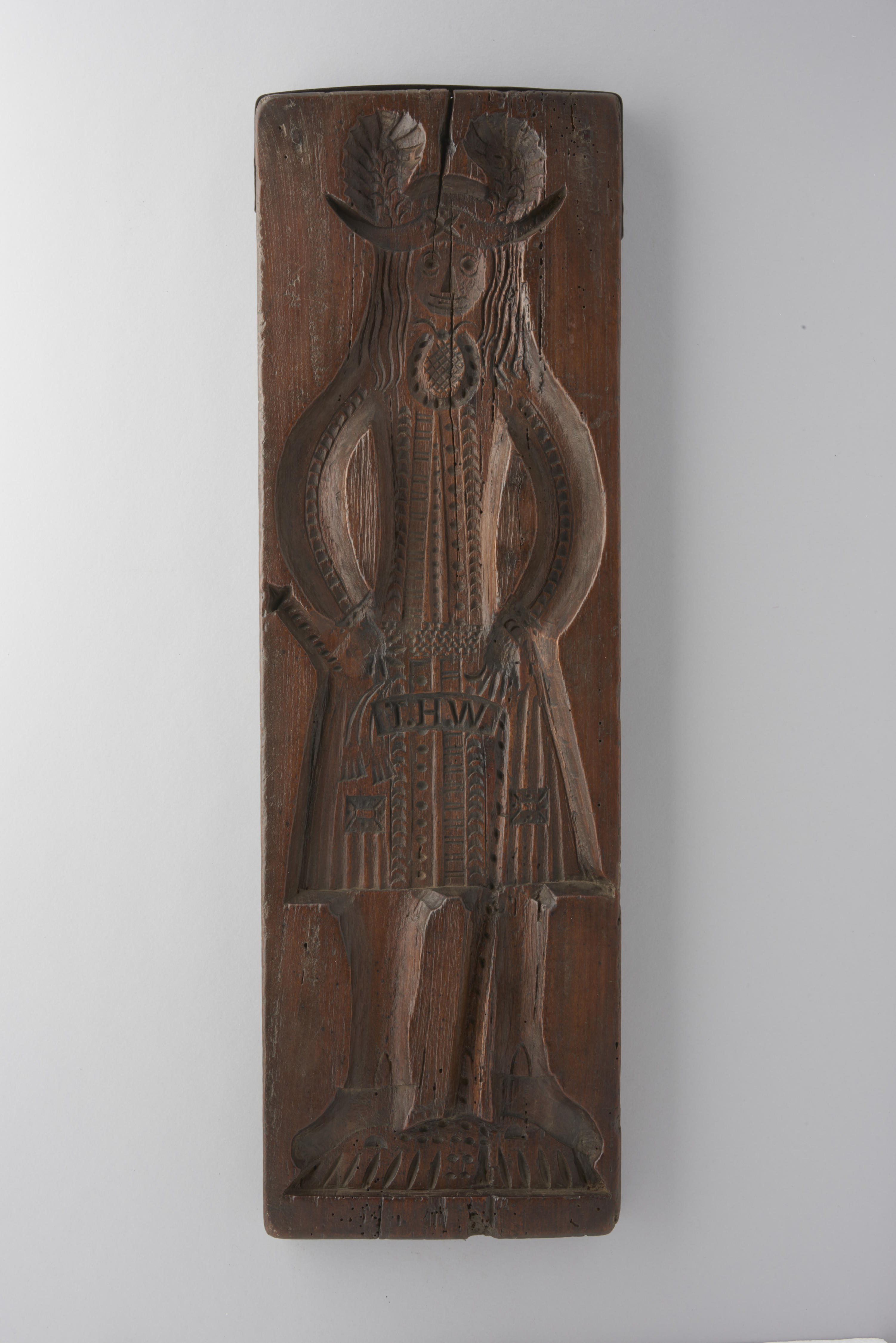 Essenhouten koekplank, aan één zijde besneden met een voorstelling van een man. Op zijn schoot staan in spiegelschrift de letters: 'W.H.T'.