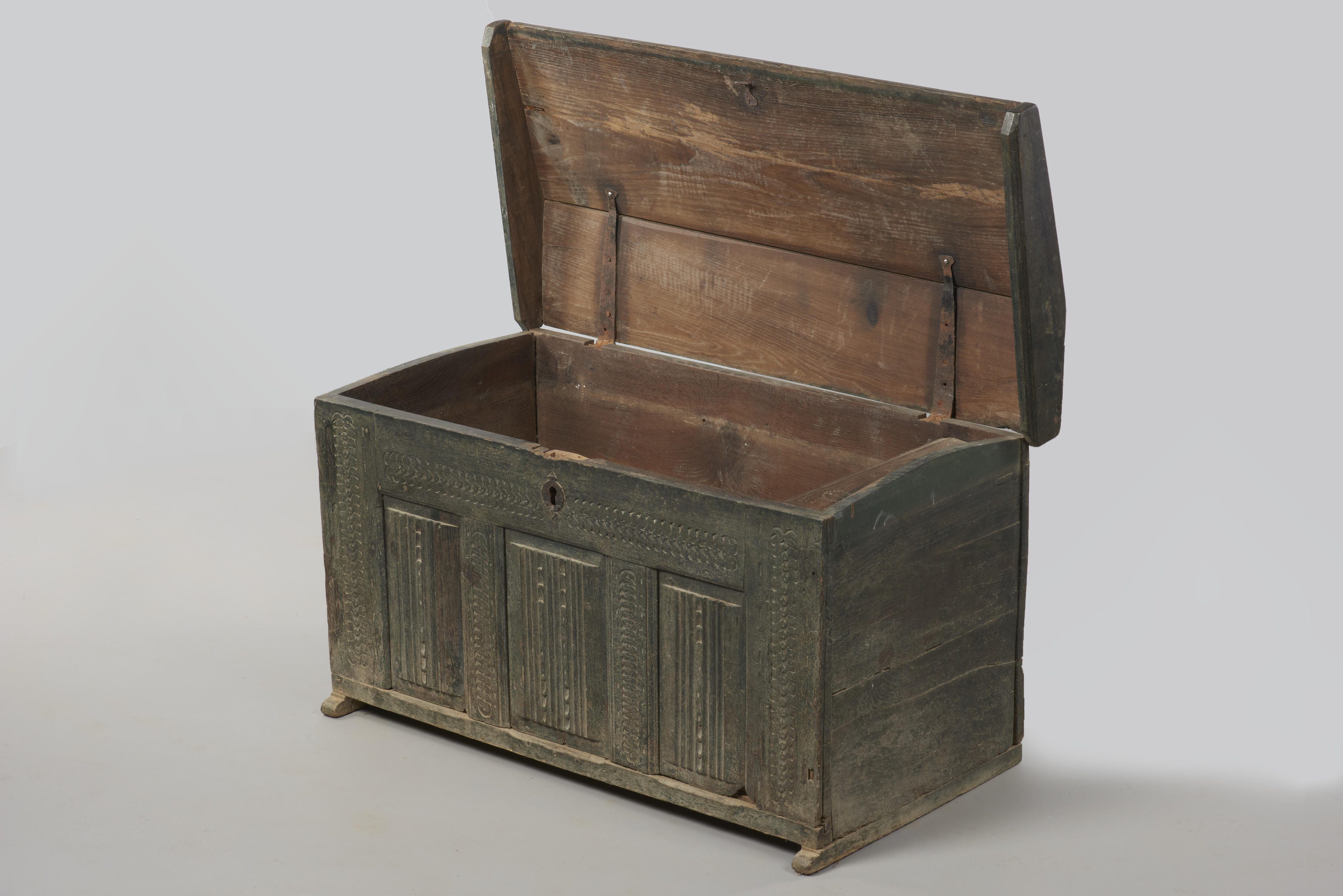 Eikenhouten tuugkist met dakvormig deksel. Waarschijnlijk heeft de kist dienstgedaan op de deel als opslagplaats van veevoer.