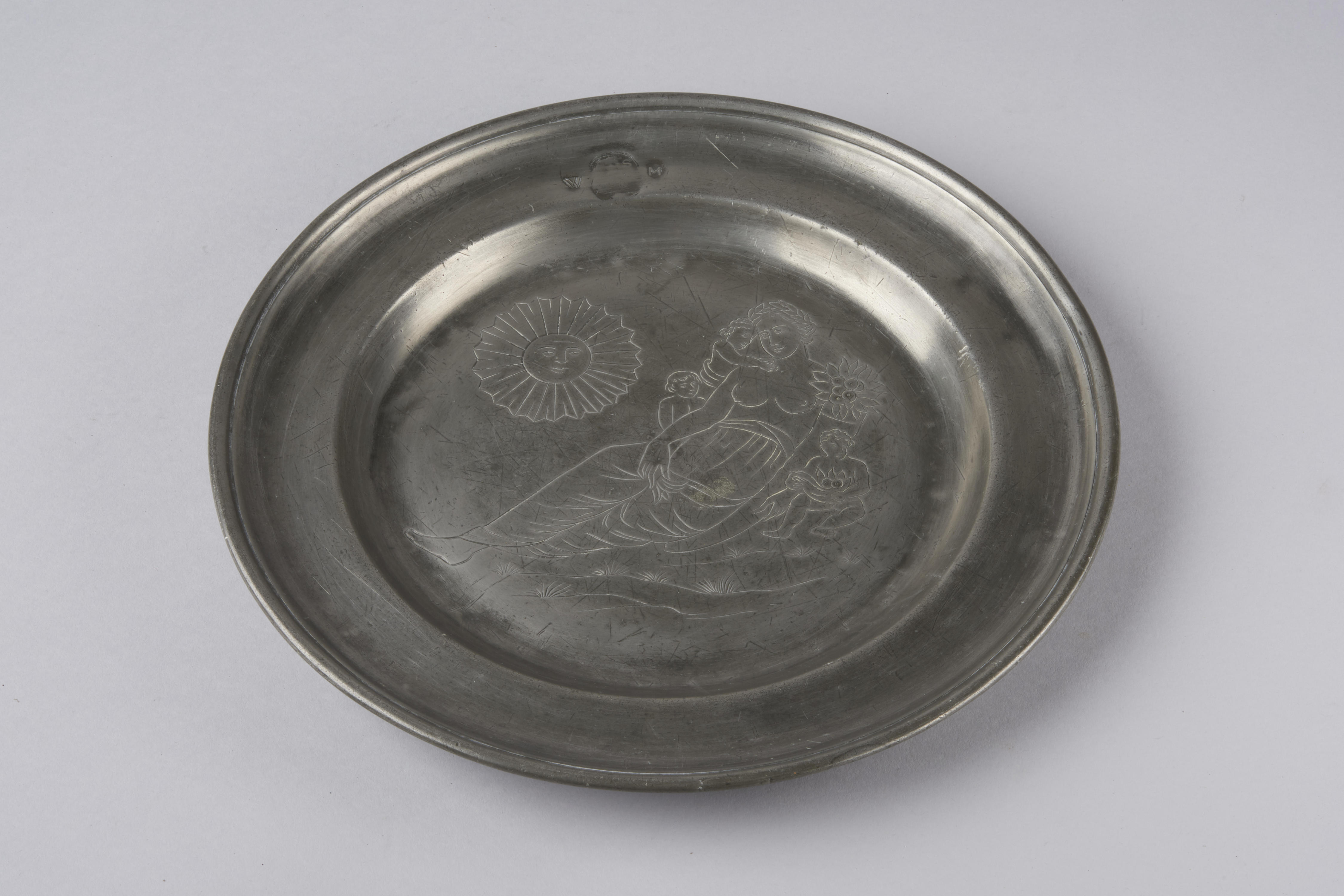 Collecteschaal van tin met een gegraveerde afbeelding van een vrouw met drie kinderen. De afbeelding is een symbool voor naastenliefde (caritas). De borsten van de vrouw zijn bloot. Zoals een moeder haar kinderen borstvoeding geeft, moet iedereen zorgen voor mensen die arm of ziek zijn. Vaak zijn zij voor voedsel, zorg en onderdak afhankelijk van ...