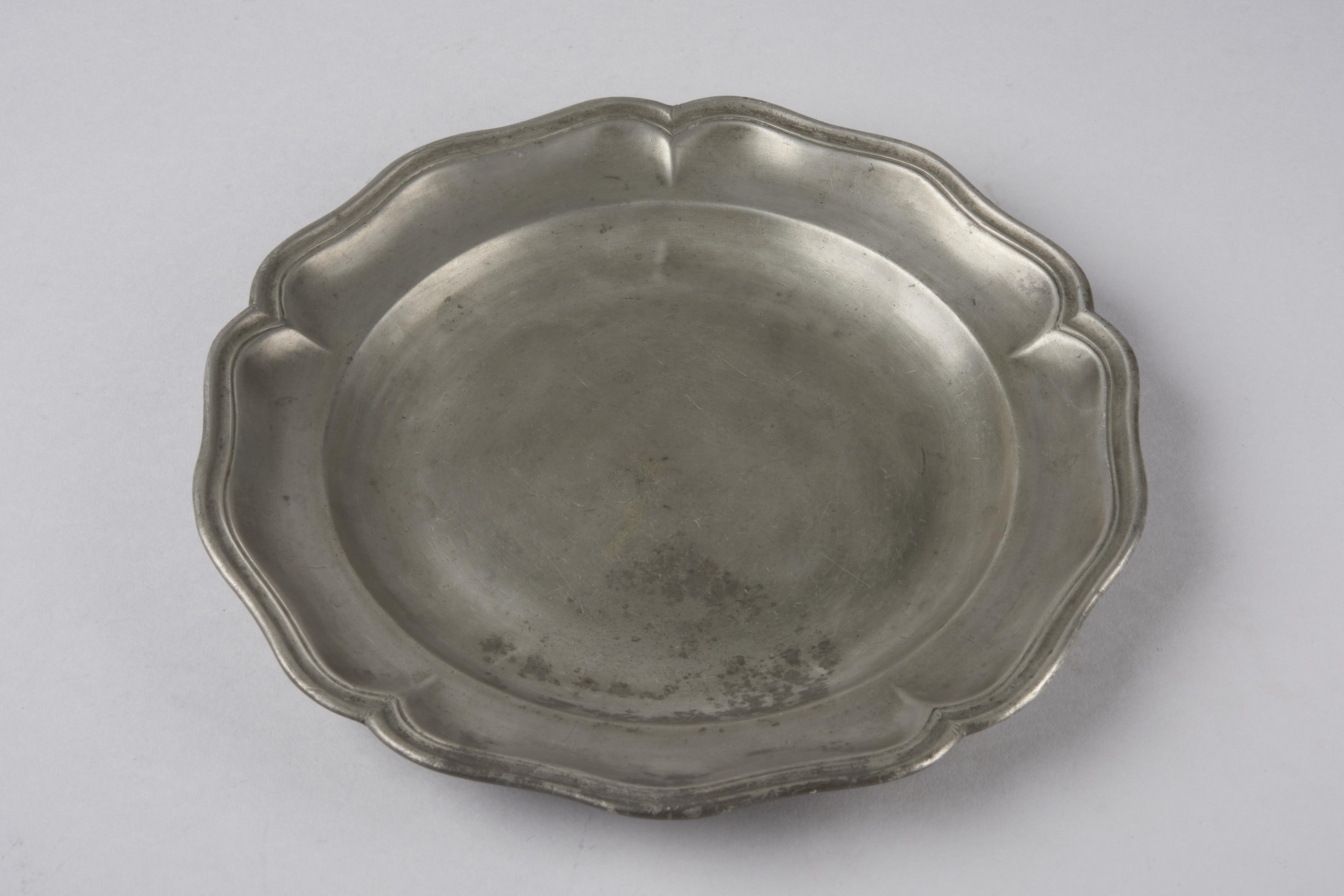 Tinnen schotel, gemerkt op de achterzijde: 'ANGLETER', met daaronder twee over elkaar heen geslagen merken.