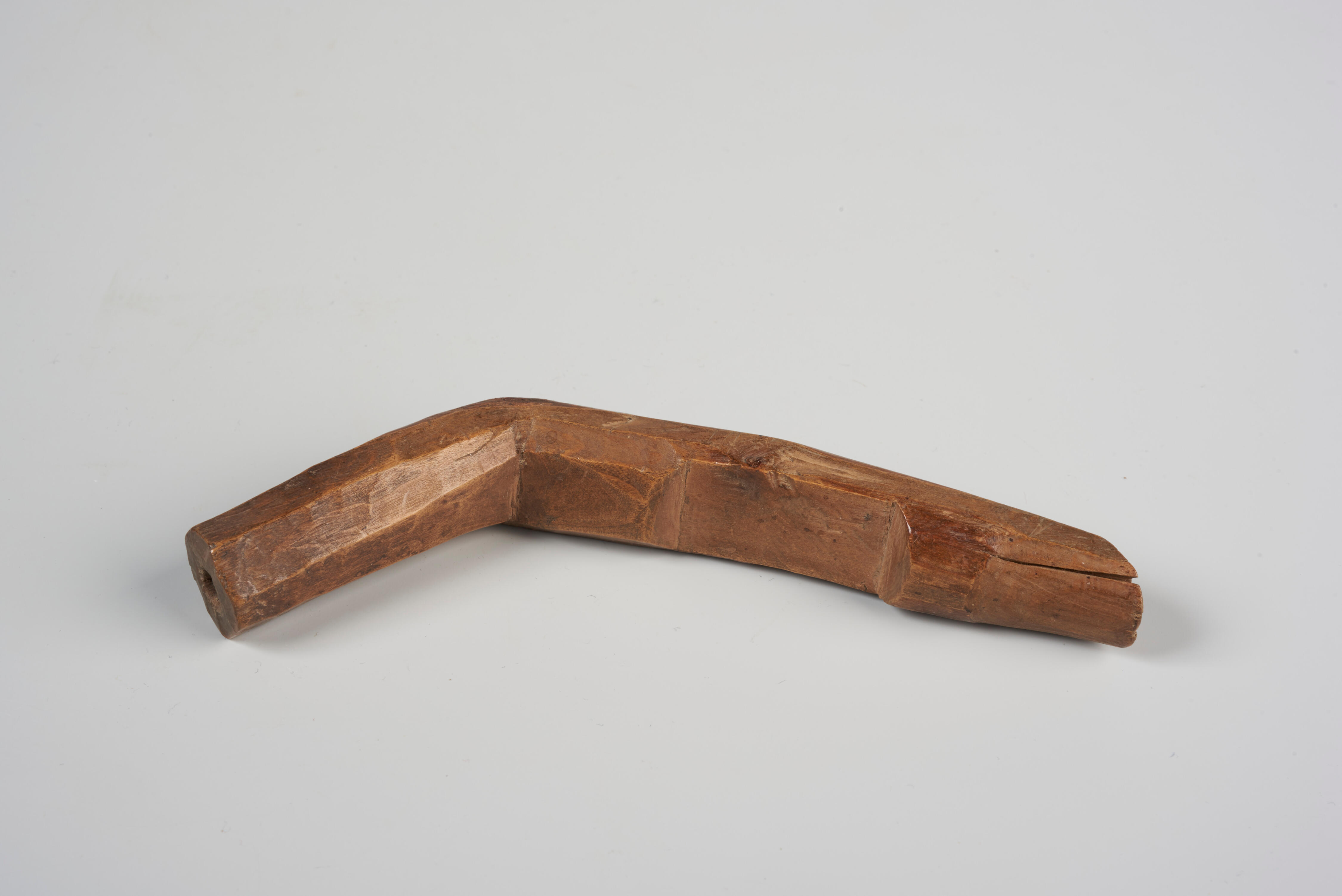 Houten breischede voor een man, afkomstig uit Staphorst. Een breischede wordt gebruikt bij het breien van bijvoorbeeld kousen met (vier) korte breipennen. Tijdens het gebruik steekt de breier het kromme deel achter de broeksboord, zodat het ronde deel met de opening horizontaal naar voren steekt. De werkpen wordt tijdens het breien in de opening gestoken.