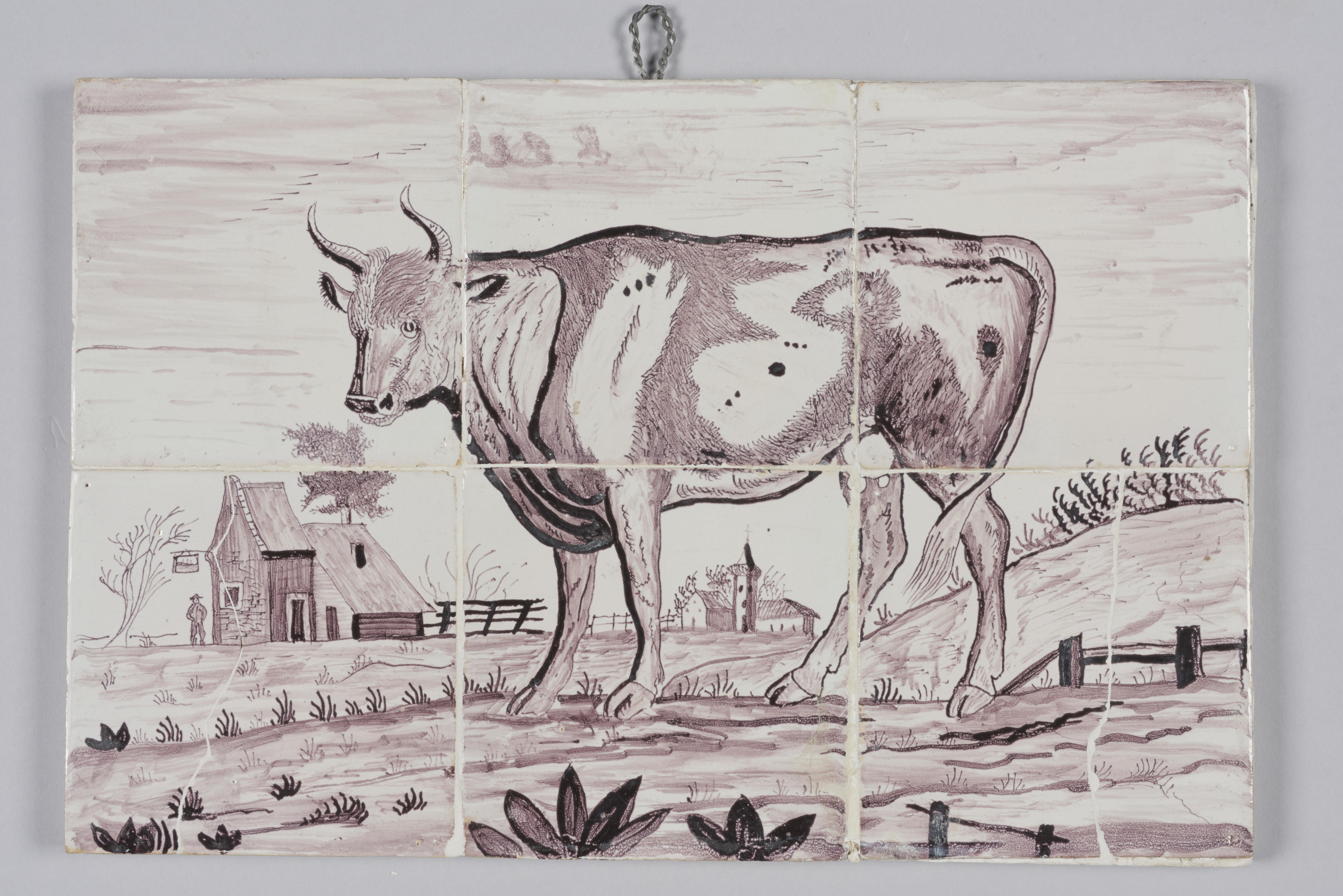 Tegeltableau, bestaande uit zes wandtegels met een afbeelding van een weiland met daarin een koe. Op de achtergrond zijn een herberg, bomen en een kerkje te zien.