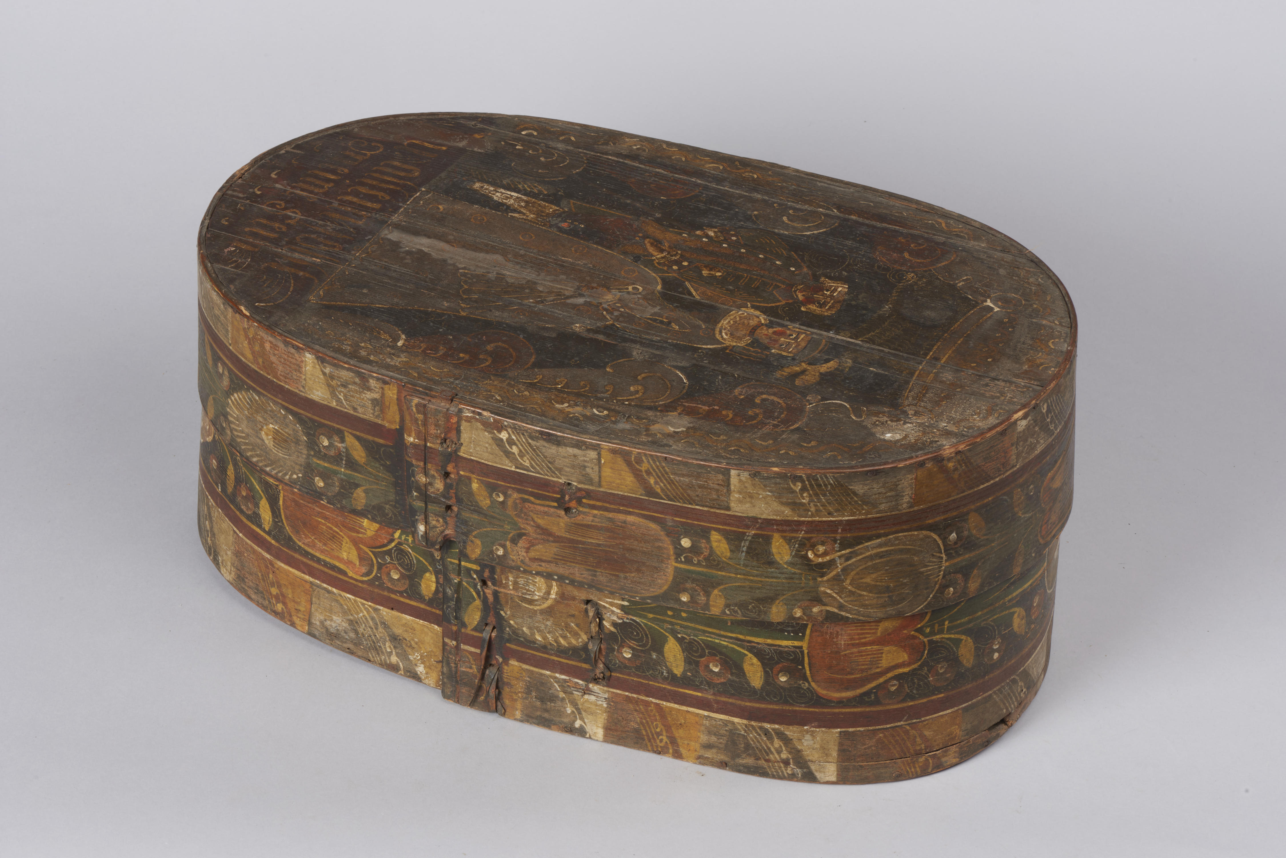 Spanen dozen zoals deze werden gebruikt als geschenk tijdens een huwelijksaanzoek. Daarom staat op het deksel een afbeelding van een paartje: zij in een getailleerde klokvormige rok met waaier, hij in een knielange jas. Op het deksel staat verder een hart met het opschrift: 'Du allein solst meine sein'. Na het aanzoek werd de doos, ...