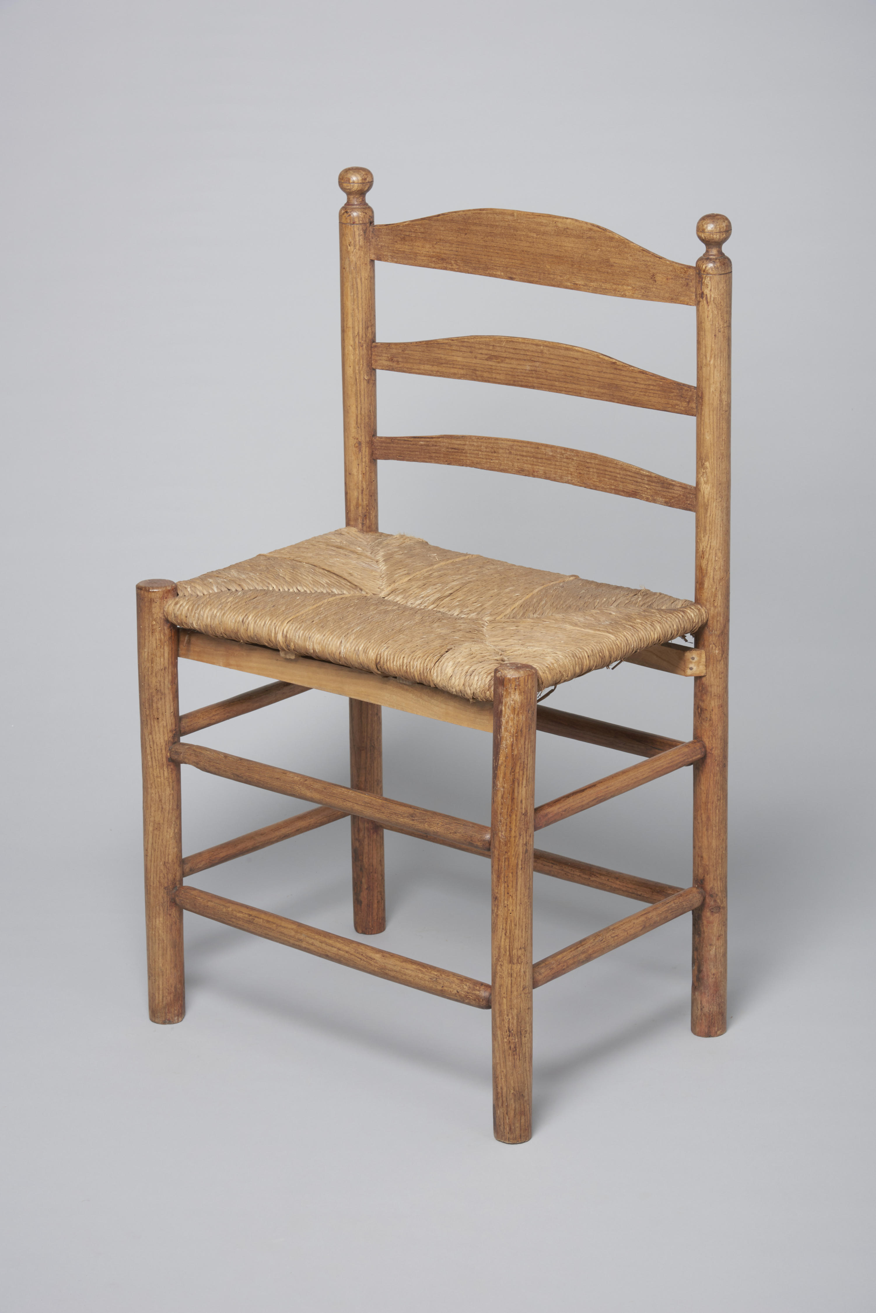 Essenhouten kerkknopstoel met de ingeslagen letters 'PFT' op de linker- en rechtervoorpoot. De onderste achterste sporten zijn ingesleten, omdat ze gebruikt zijn als voetsteun. Waarschijnlijk is het oppervlak een keer kaalgehaald en in de was gezet. De stoel draagt roodbruine verfsporen. De brug is twintigste-eeuws.