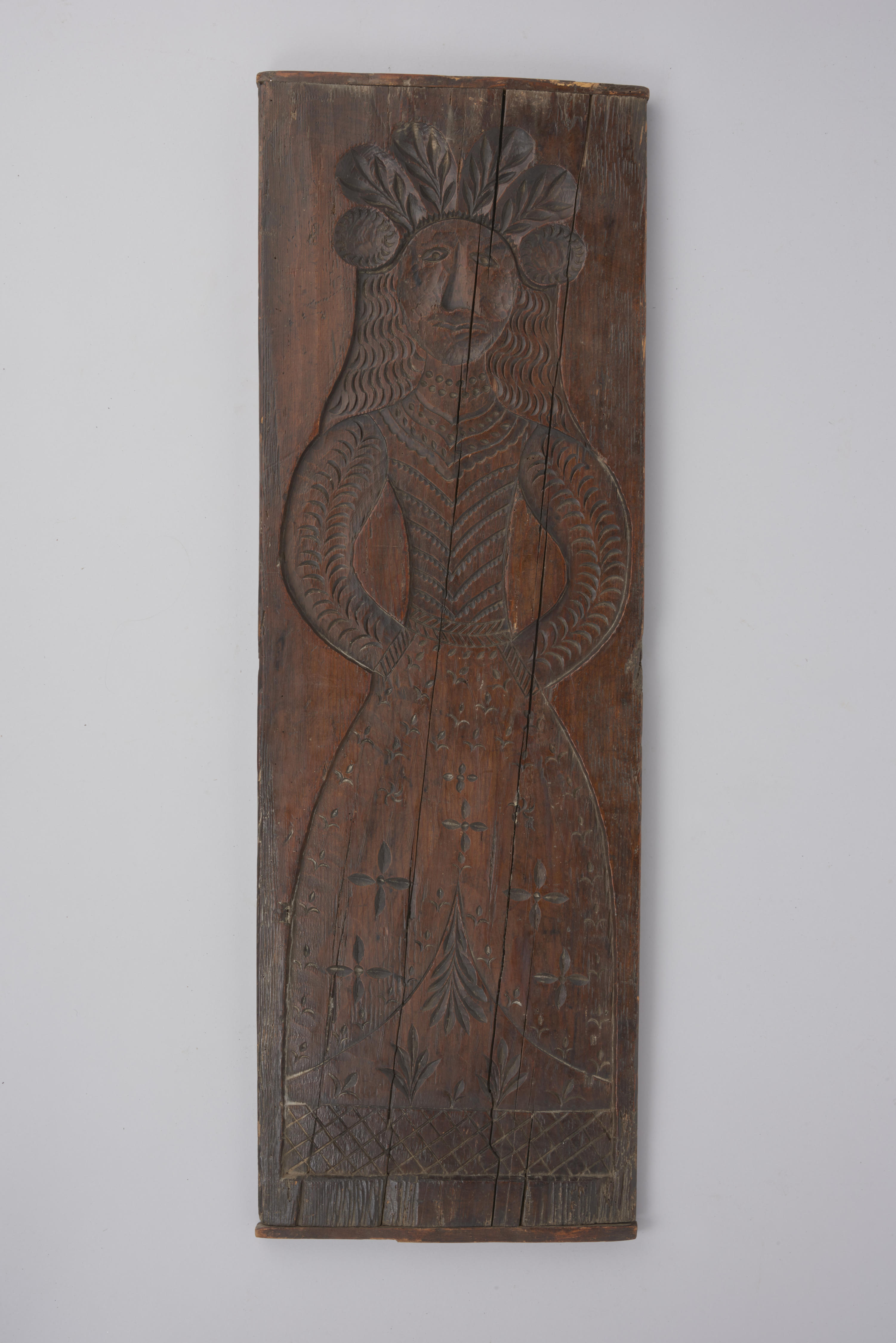 Vurenhouten koekplank, aan twee zijden besneden met een mensfiguur met lang, los haar en veren op het hoofd.