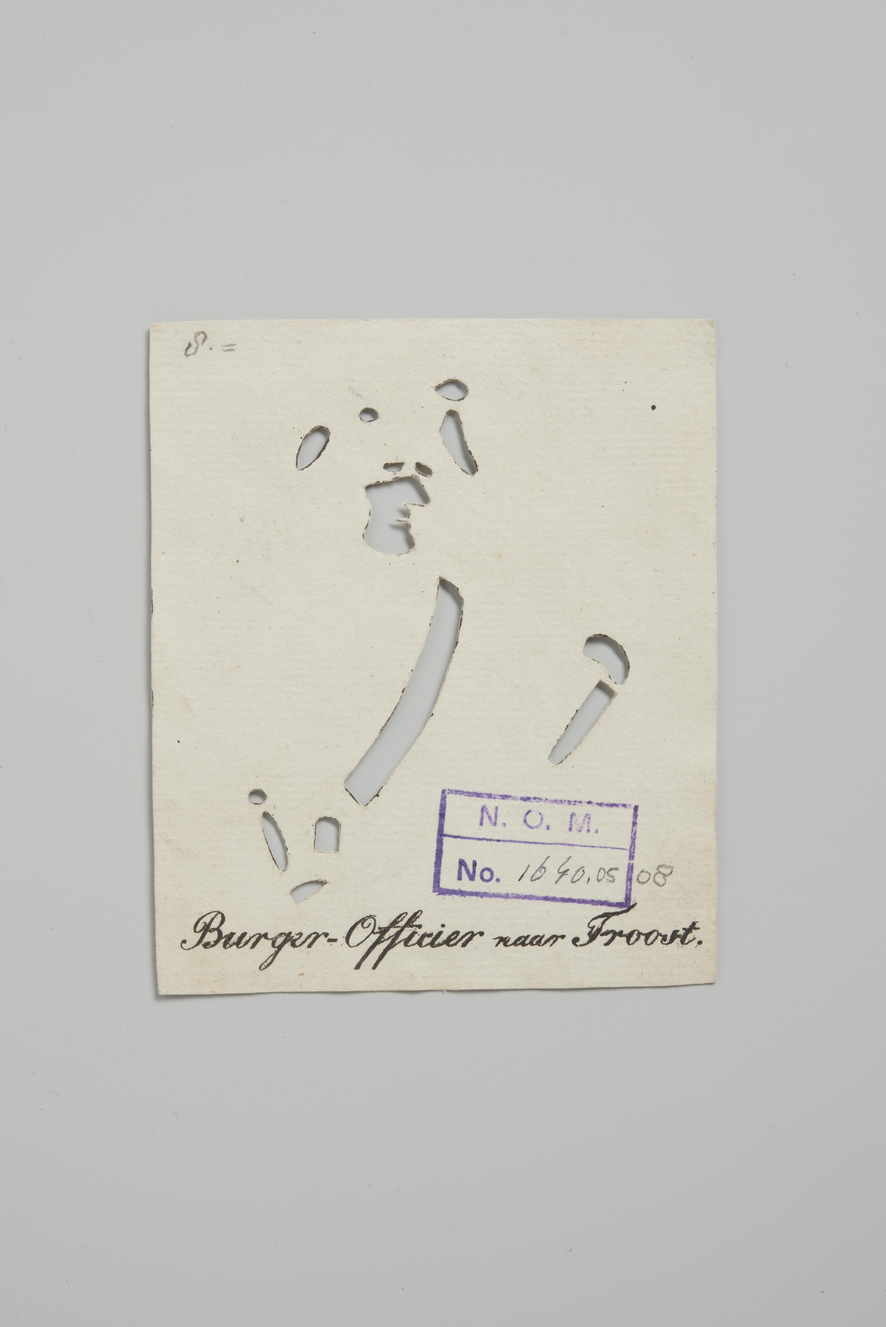 Coptografische voorstelling van een man. Het opschrift luidt: 'Burger-Officier naar Troost'. Mogelijk wordt hier de schilder Cornelis Troost (1696-1750) bedoeld.
