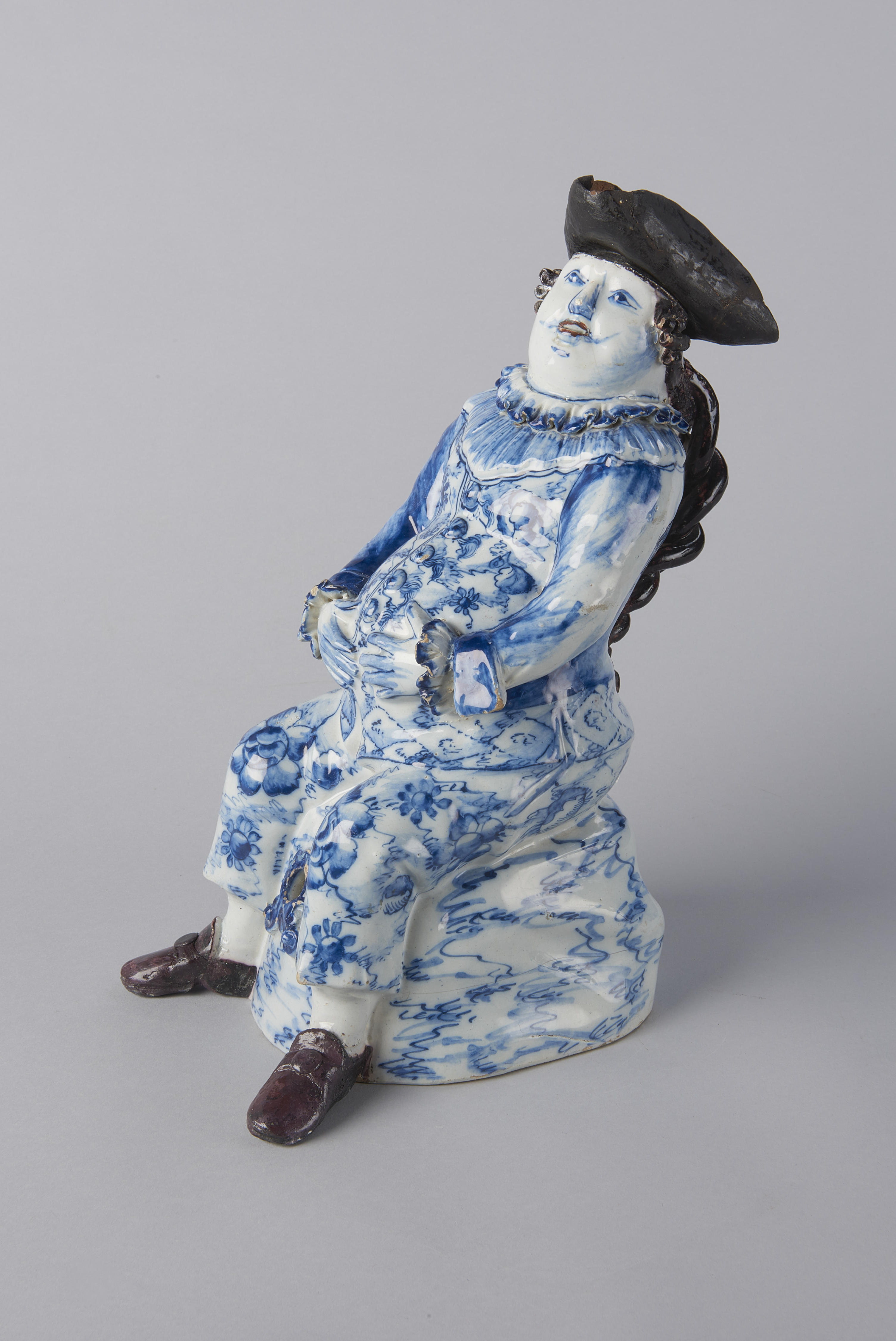 Jenevervat, voorstellende een karakter uit de Italiaanse opera ´Commedia dell'arte´, waarschijnlijk Pulcinella. Zijn lange vlecht dient als handvat. Het messing kraantje tussen de benen ontbreekt. De driepuntsteek op het hoofd dient als dop, alwaar het vat gevuld kan worden. Een dergelijk jenevervat stond in de regel op een buffet.