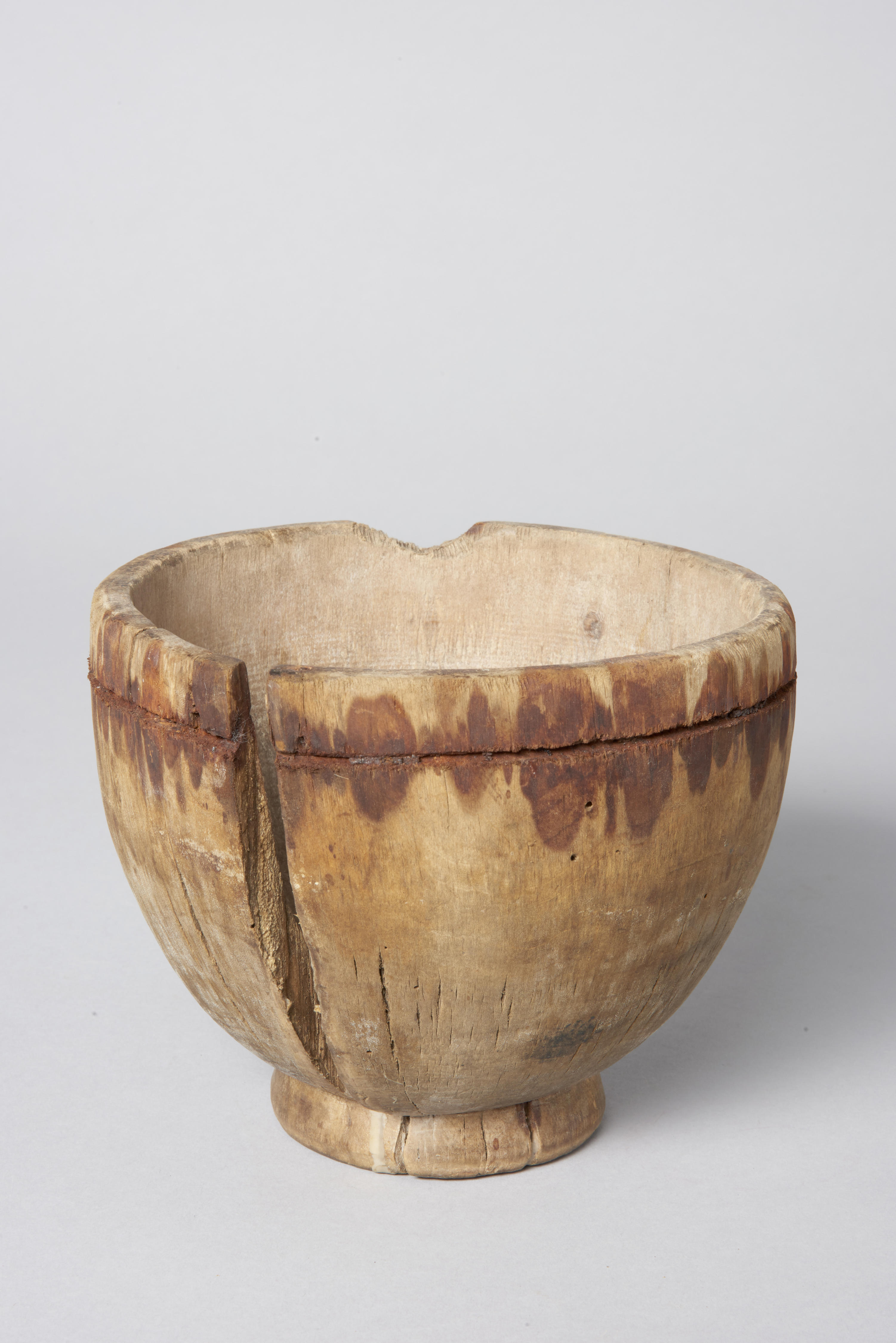 Bolvormige kaaskop van iepenhout, aflopend in een rond voetstuk. In de zijkant zit een grote barst. Kaaskoppen werden in houtzagerijen vervaardigd door zogenaamde ‘koppendraaiers’. Op de draaibank of ‘wipbank’, die met de voet werd aangedreven, werden de houten kaasvormen gedraaid. In de Noord-Hollandse steden waren doorgaans meerdere van deze werkplaatsen actief. Het uiterlijk van de ...