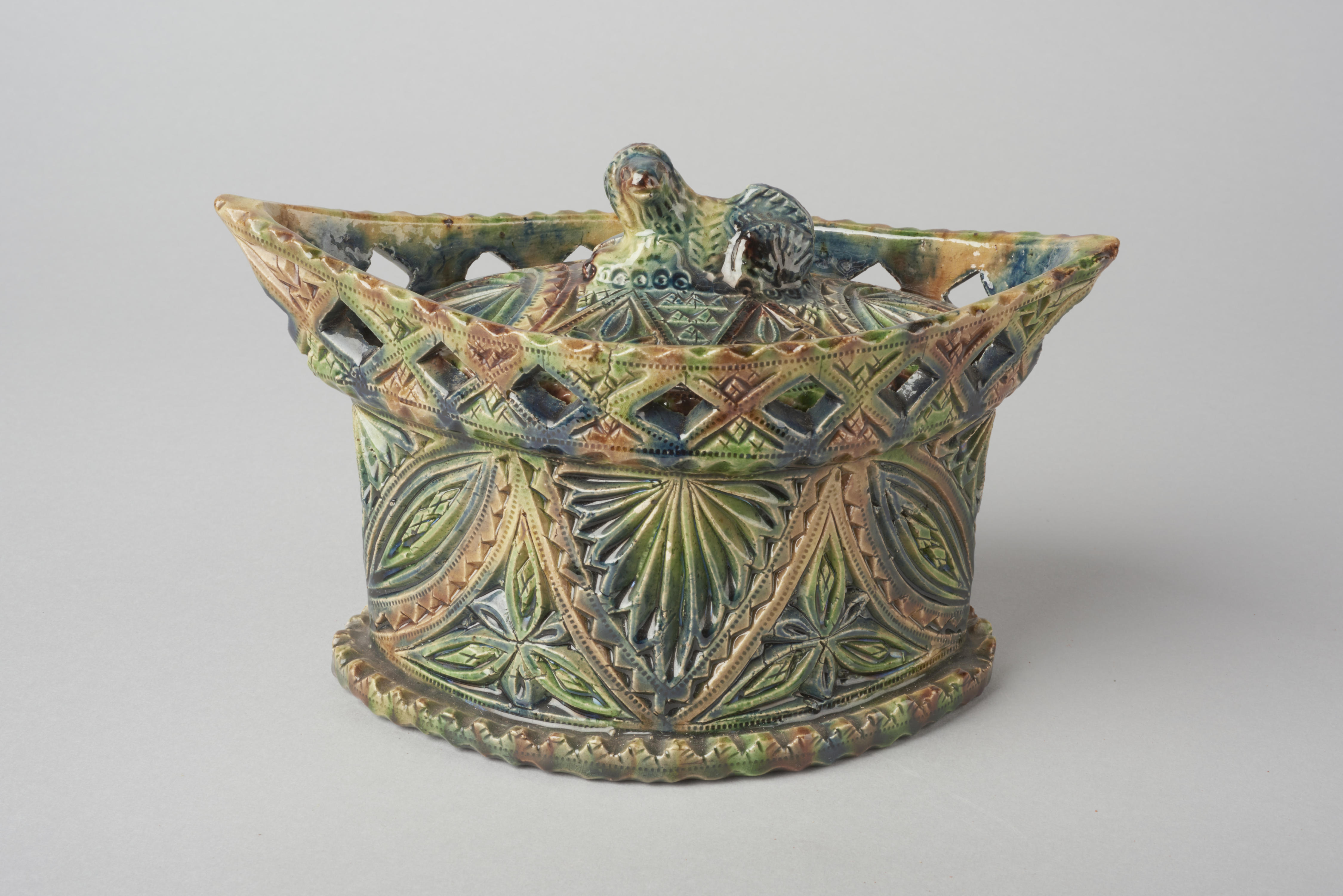 Tabakspot, versierd met geometrische ornamenten en een beeldje in de vorm van een hond op het deksel.