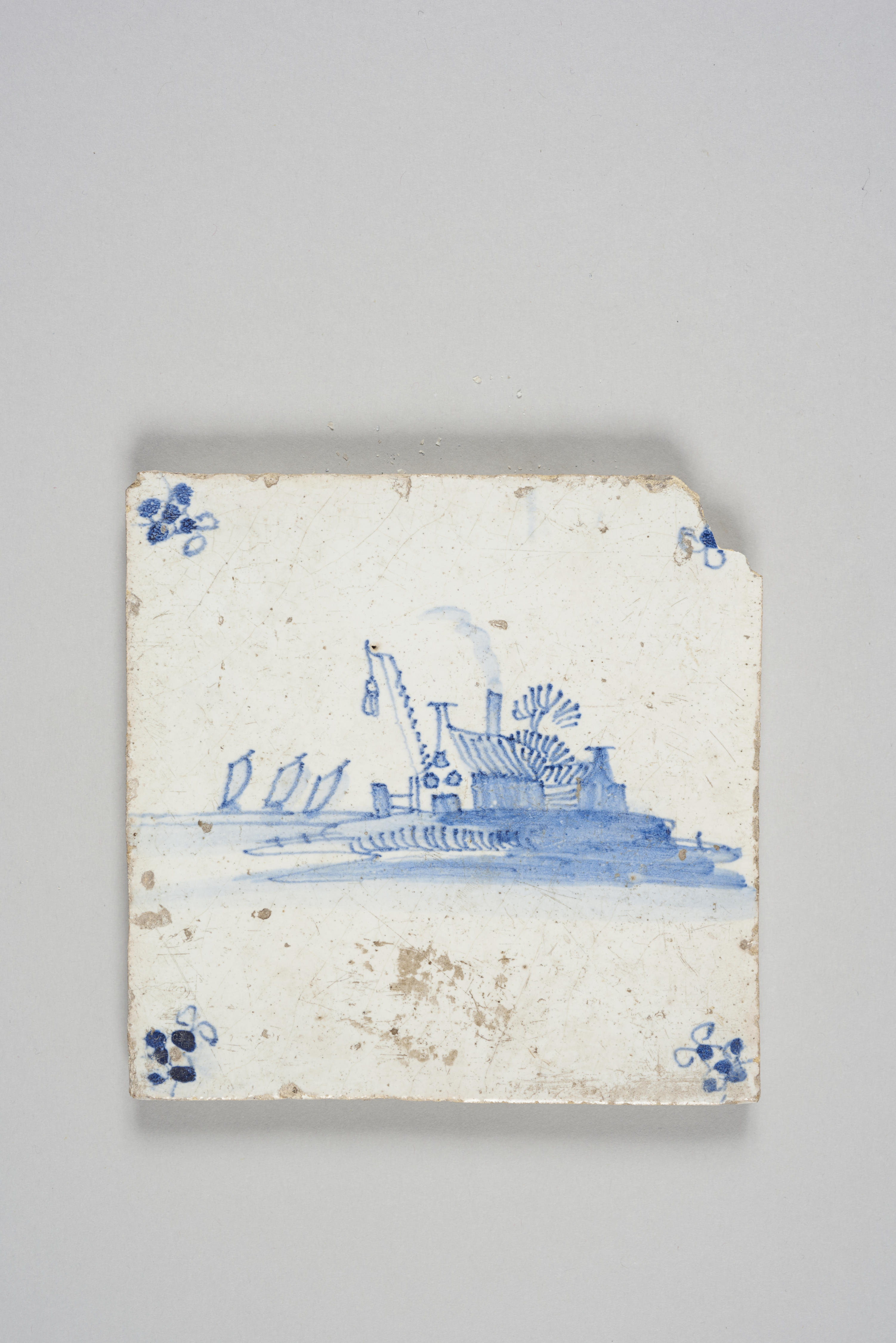 Wandtegel met een afbeelding van een landschap; blauw; hoekmotief: spin.
