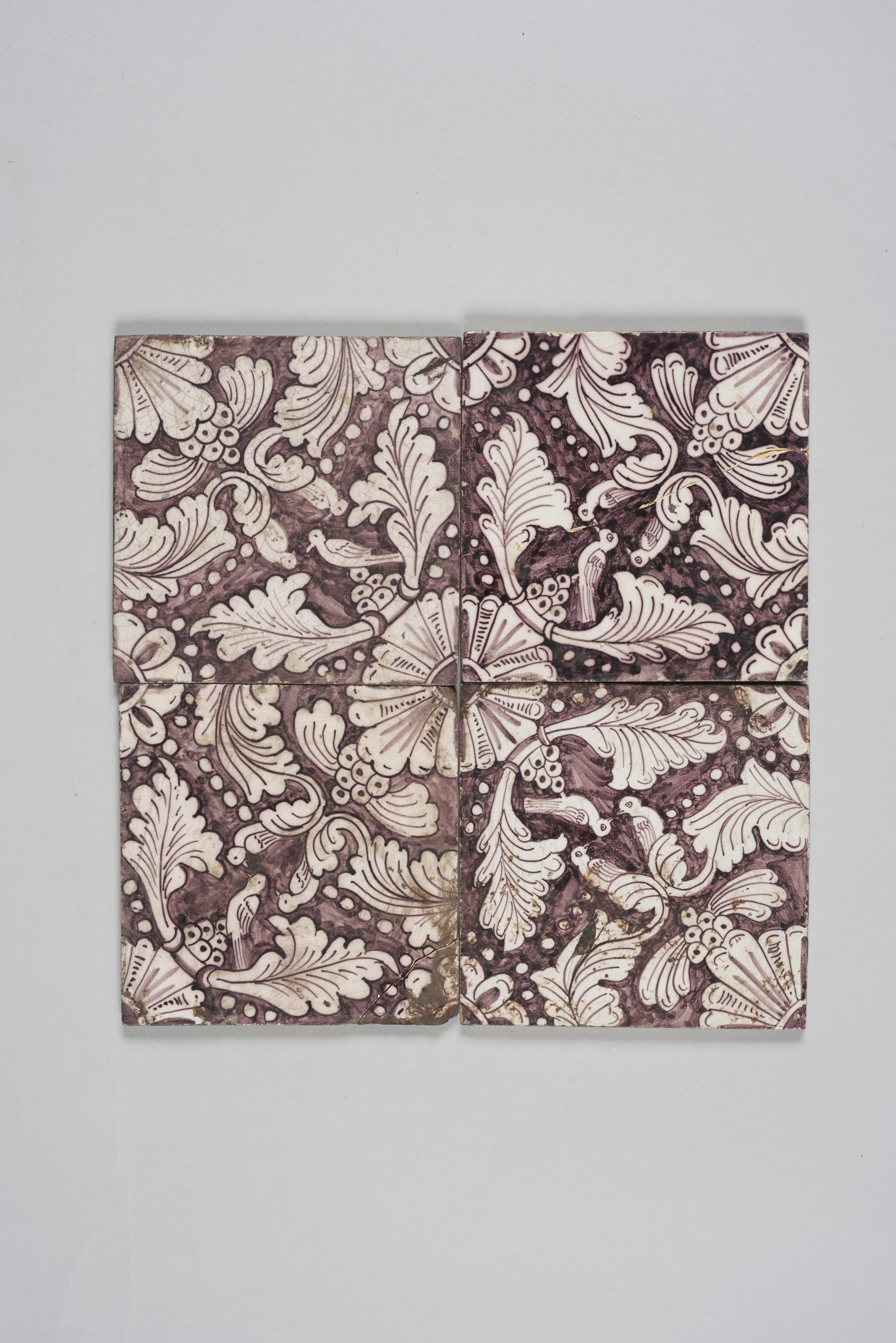 Veld van vier wandtegels met een ornamentdecor; mangaanpaars. De enkele tegel heeft een diagonaal decor met drie vogels, bladranken en vier hoekmotieven.