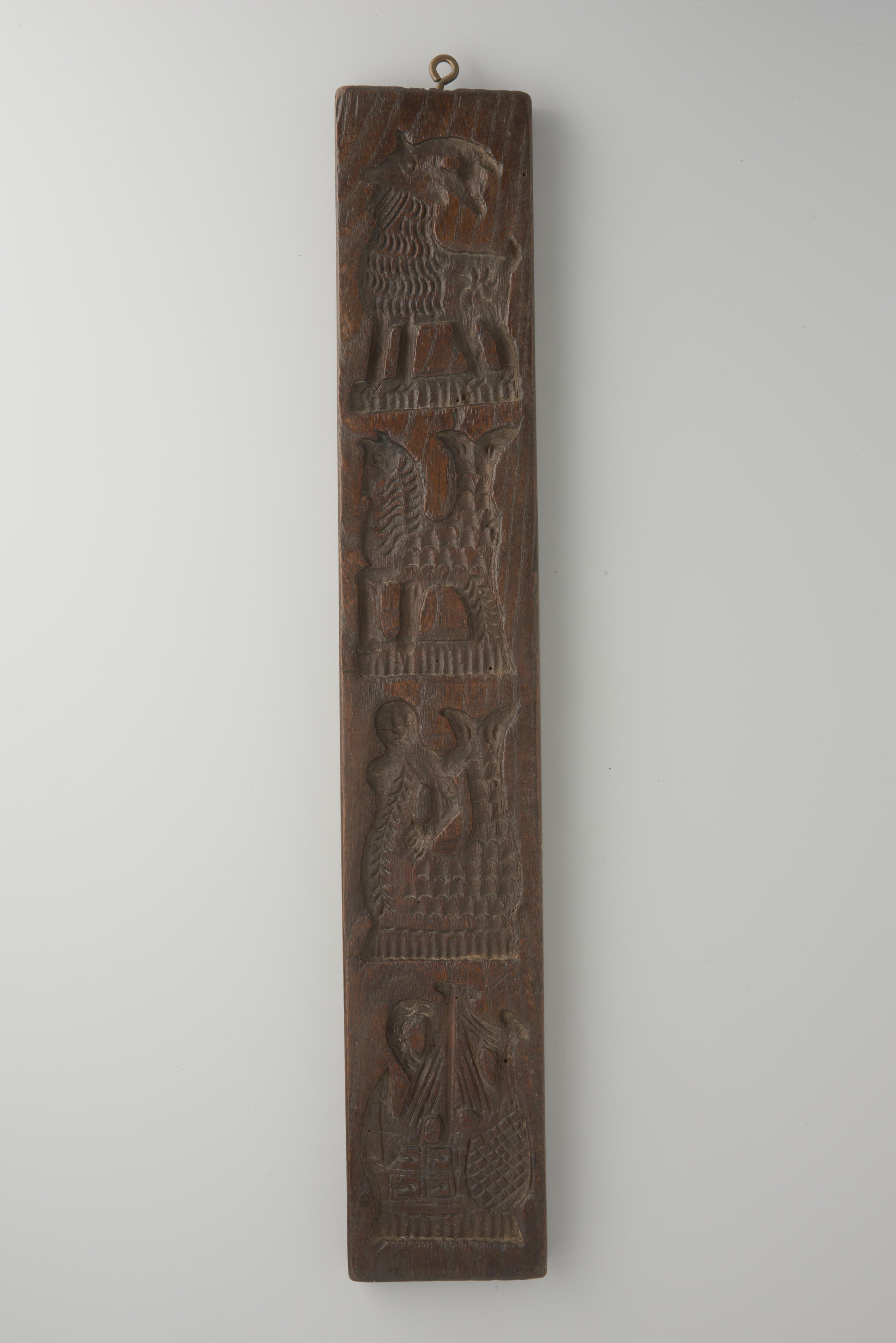 Essenhouten koekplank. De plank is aan één zijde besneden met vier voorstellingen: een bok, een hippocampus, een zeemeermin en een zeilschip. De andere zijde van de plank is besneden met vier voorstellingen: een vos, een hond, een kat en een ruiter te paard.