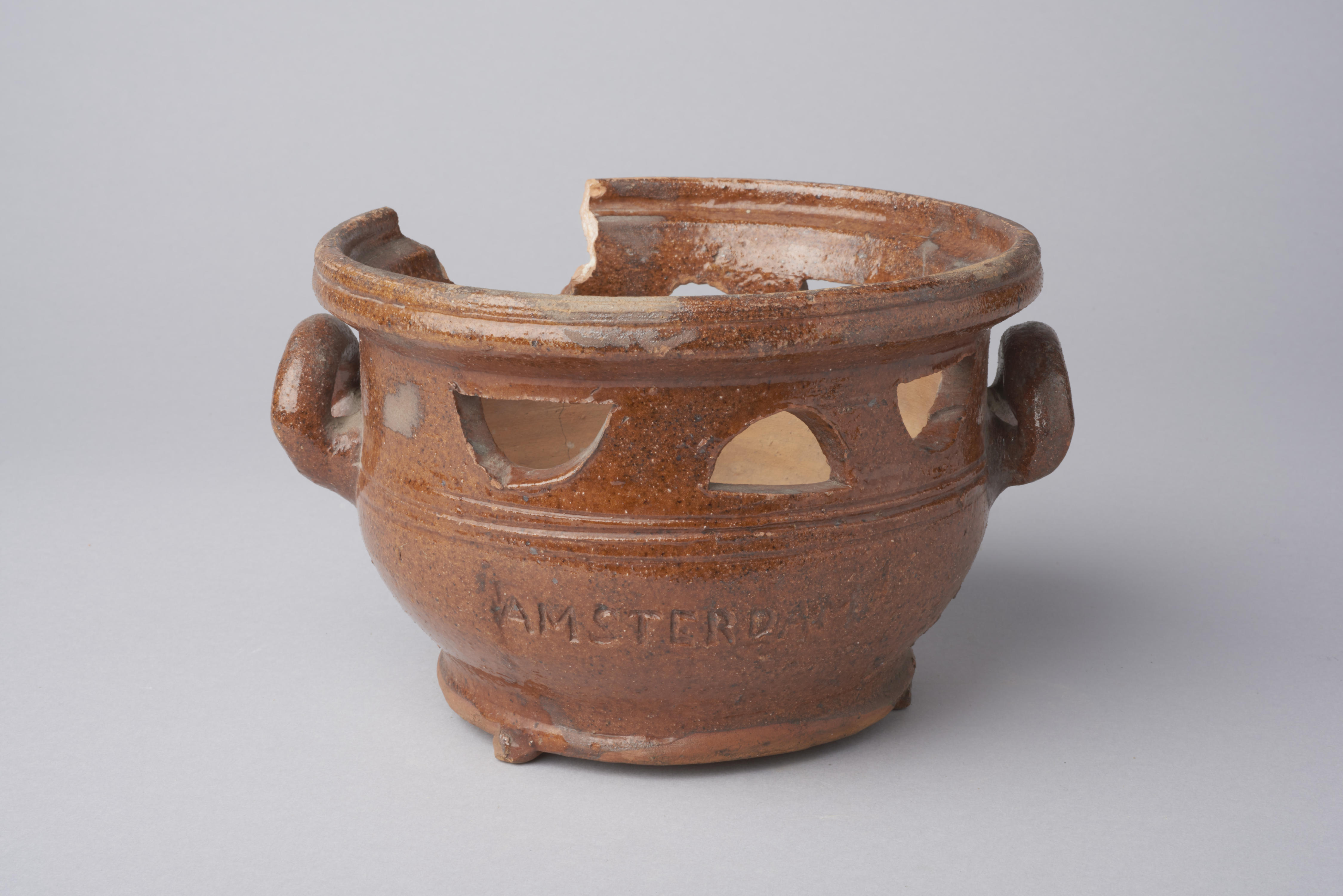 Komfoor met de ingestempelde tekst: 'GLOEDFABRIEK DE VULKAAN AMSTERDAM'.