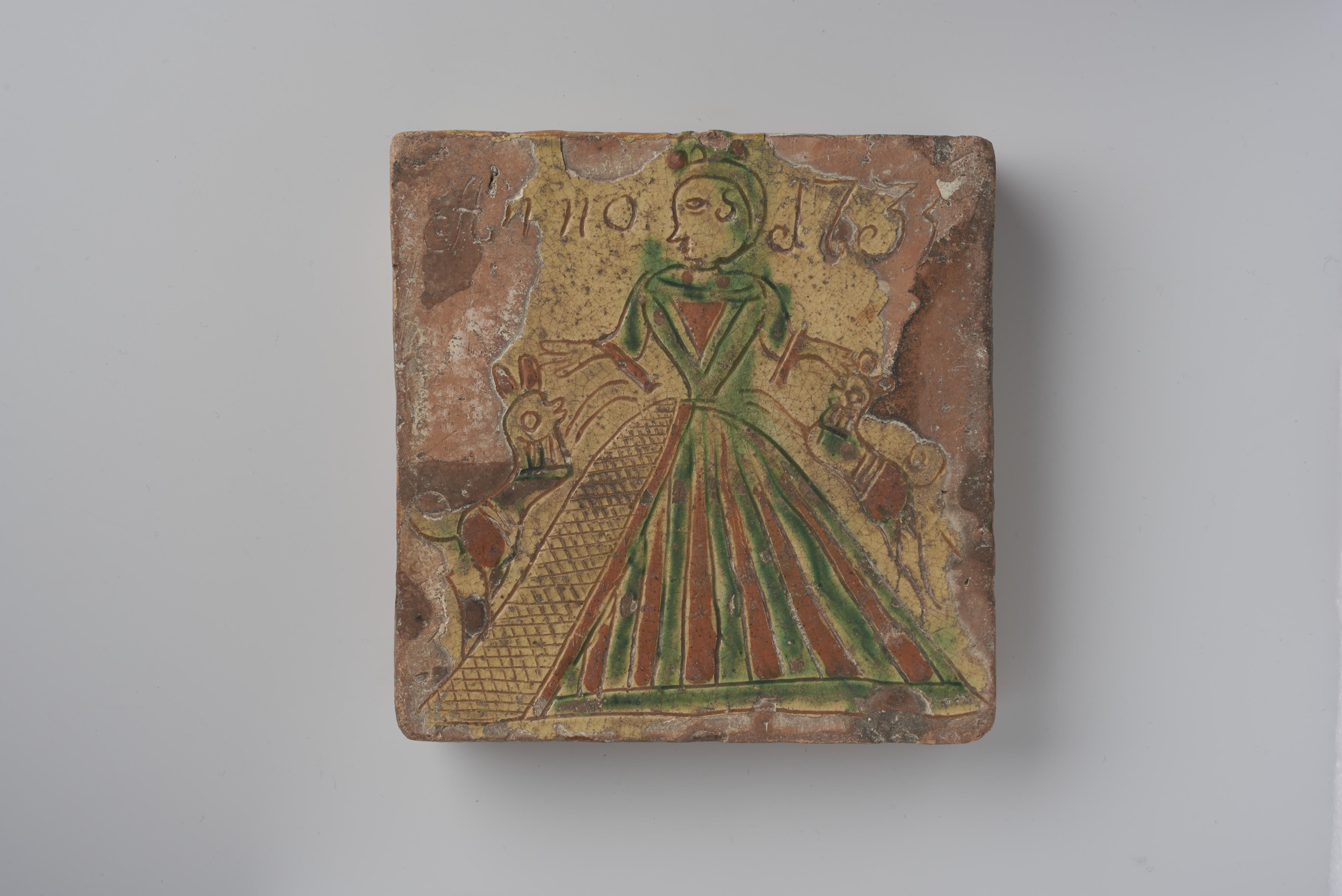 Wand- of haardtegel met een voorstelling van een vrouw met aan weerszijden twee omhoogspringende hondjes. Het opschrift luidt: 'ANNO 1735'.