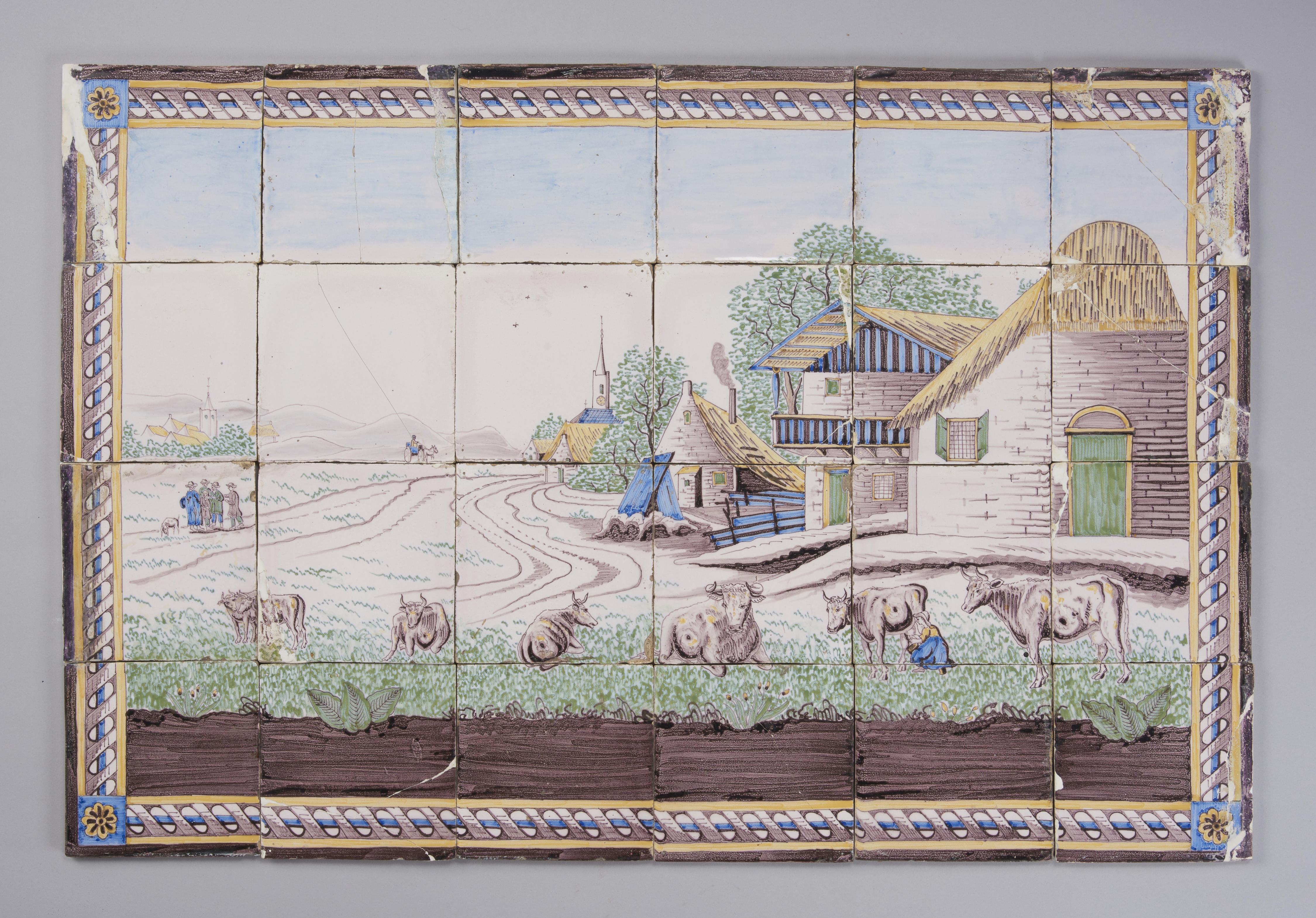 Tegeltableau bestaande uit 24 wandtegels met een afbeelding van een landschap met boerderijen en vee; veelkleurig; 1850-1900. Op de voorgrond staan zeven koeien, waarvan één zojuist gemolken wordt. Rechts daarachter zijn drie boerderijen te zien. Op de achtergrond is een kerktoren zichtbaar. Een figuur op een kar nadert vanuit de heuvels in de verte. Een ...