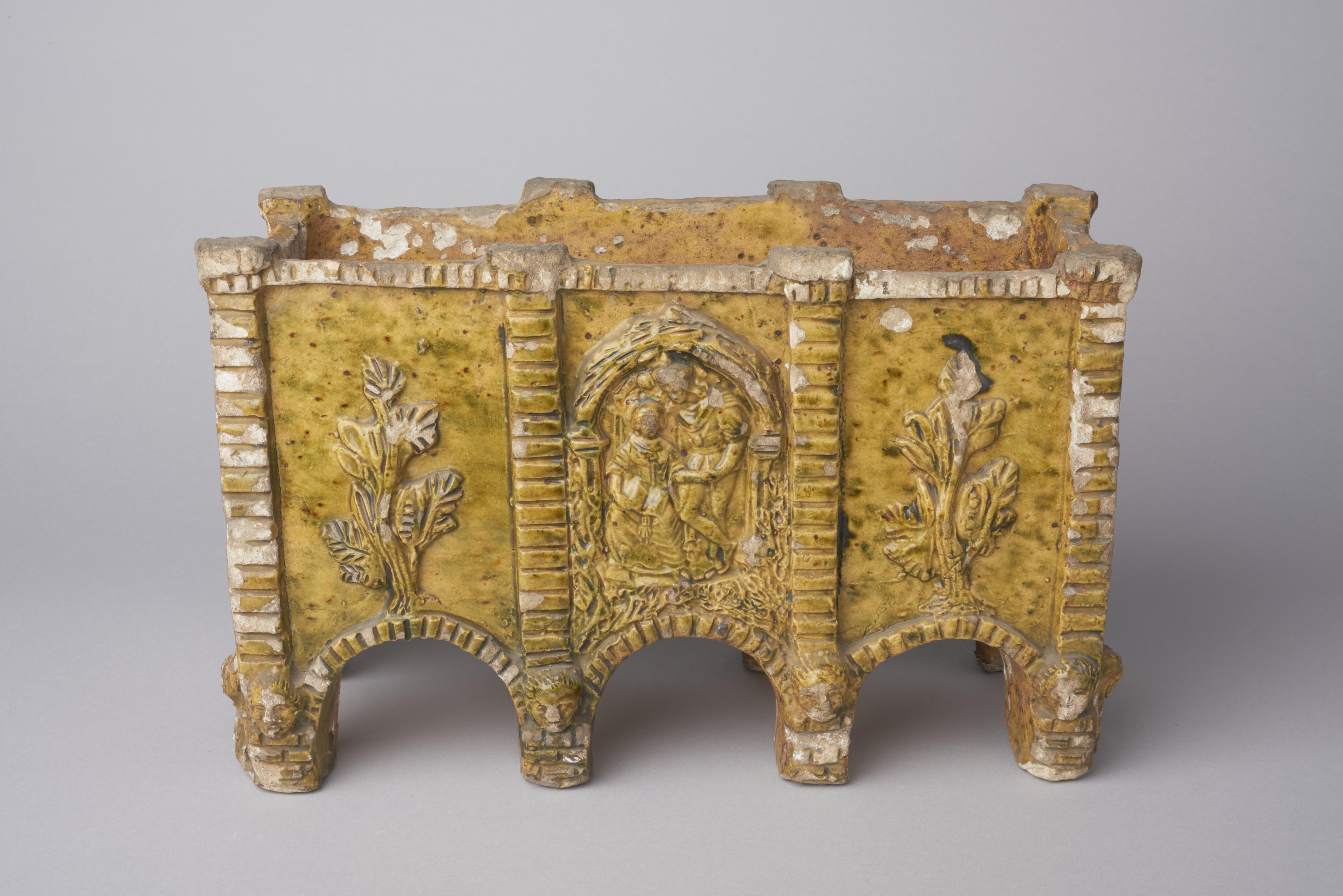 Sierpot of plantenbak. Op de vlakken van de bak zijn reliëffiguren met behulp van drukvormen aangebracht. De middelste voorstellingen op de lange zijvlakken stellen een boogvorm voor waaronder een zittende vrouwen- en een staande mannenfiguur te zien zijn. Op de andere vlakken zijn bloemversieringen aangebracht.