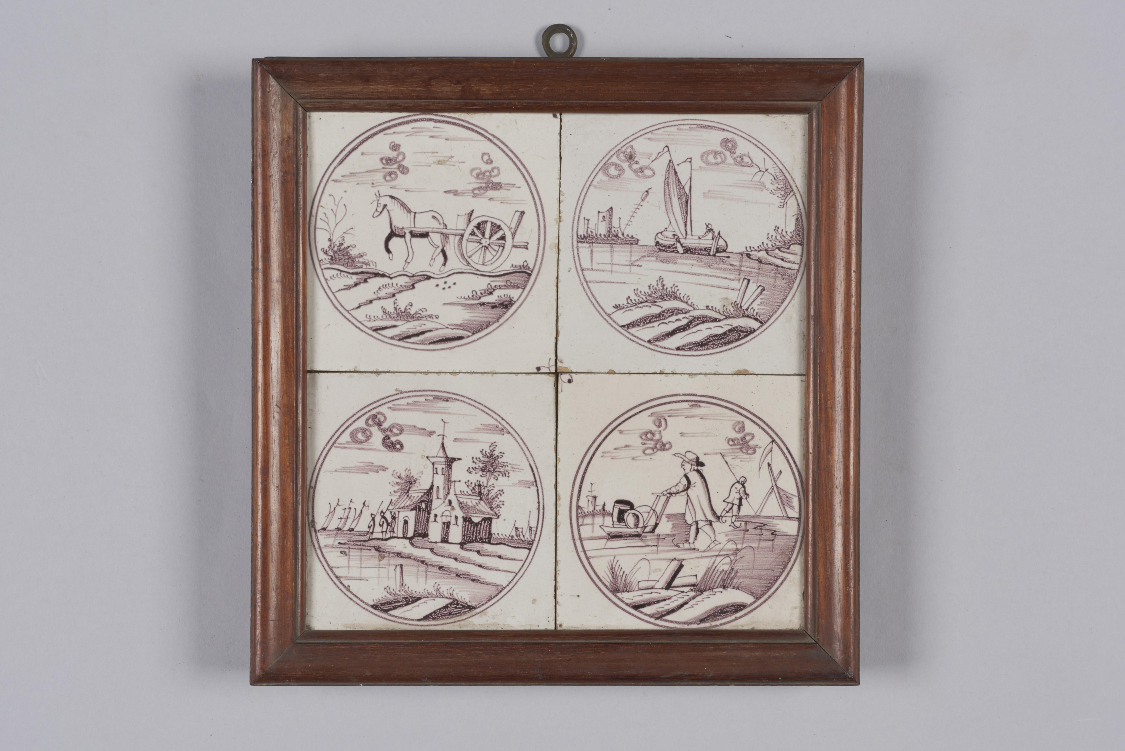 Vier ingelijste wandtegels met een afbeelding van een landschap in een cirkel; mangaanpaars. Op elke tegel staat een andere afbeelding. Linksboven: een landschap met een paard en wagen. Rechtsboven: een landschap met een zeilboot. Linksonder: een landschap met een kerk. Rechtsonder: een landschap met twee mannen op schaatsen en een duwslee.
