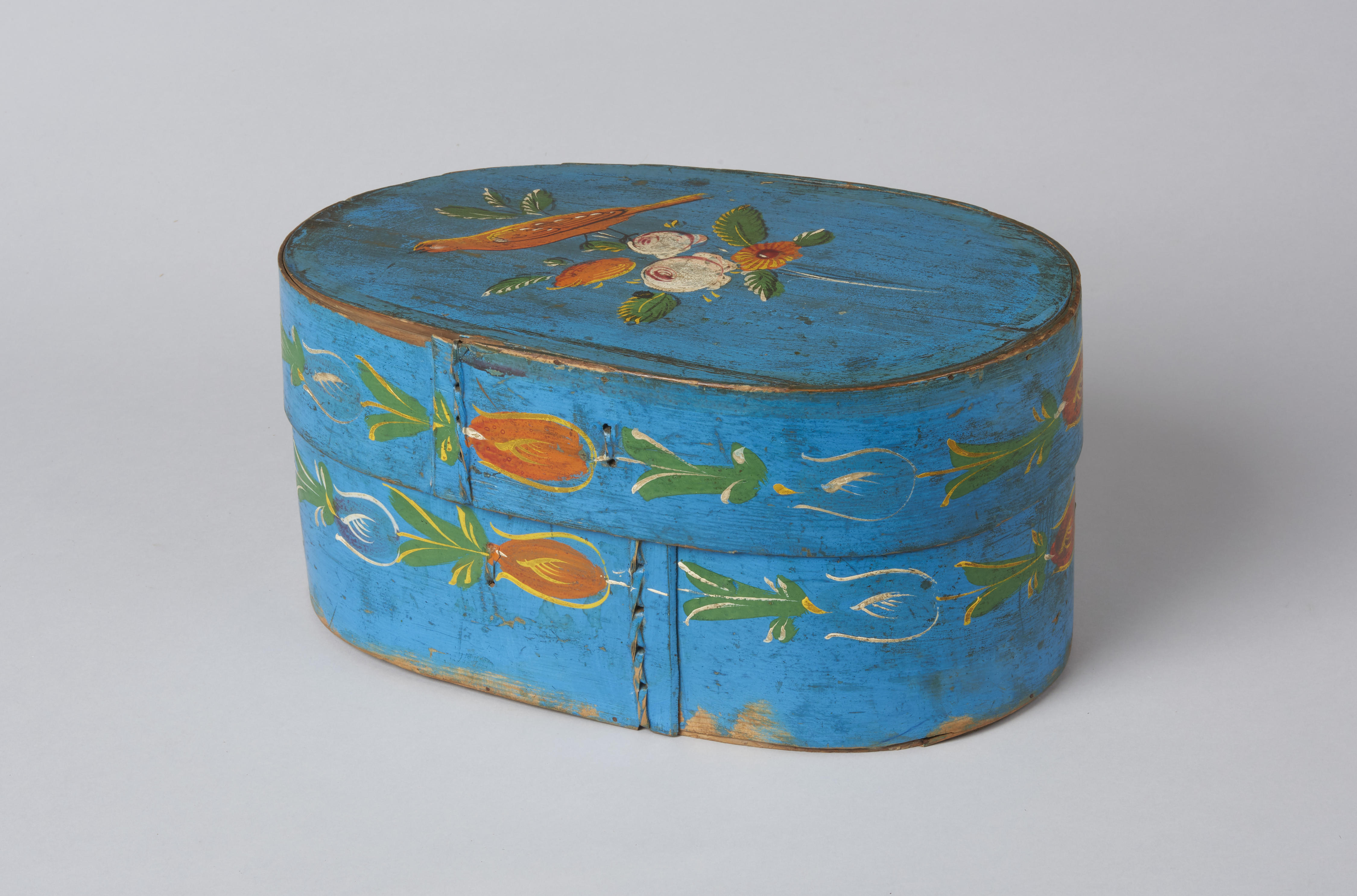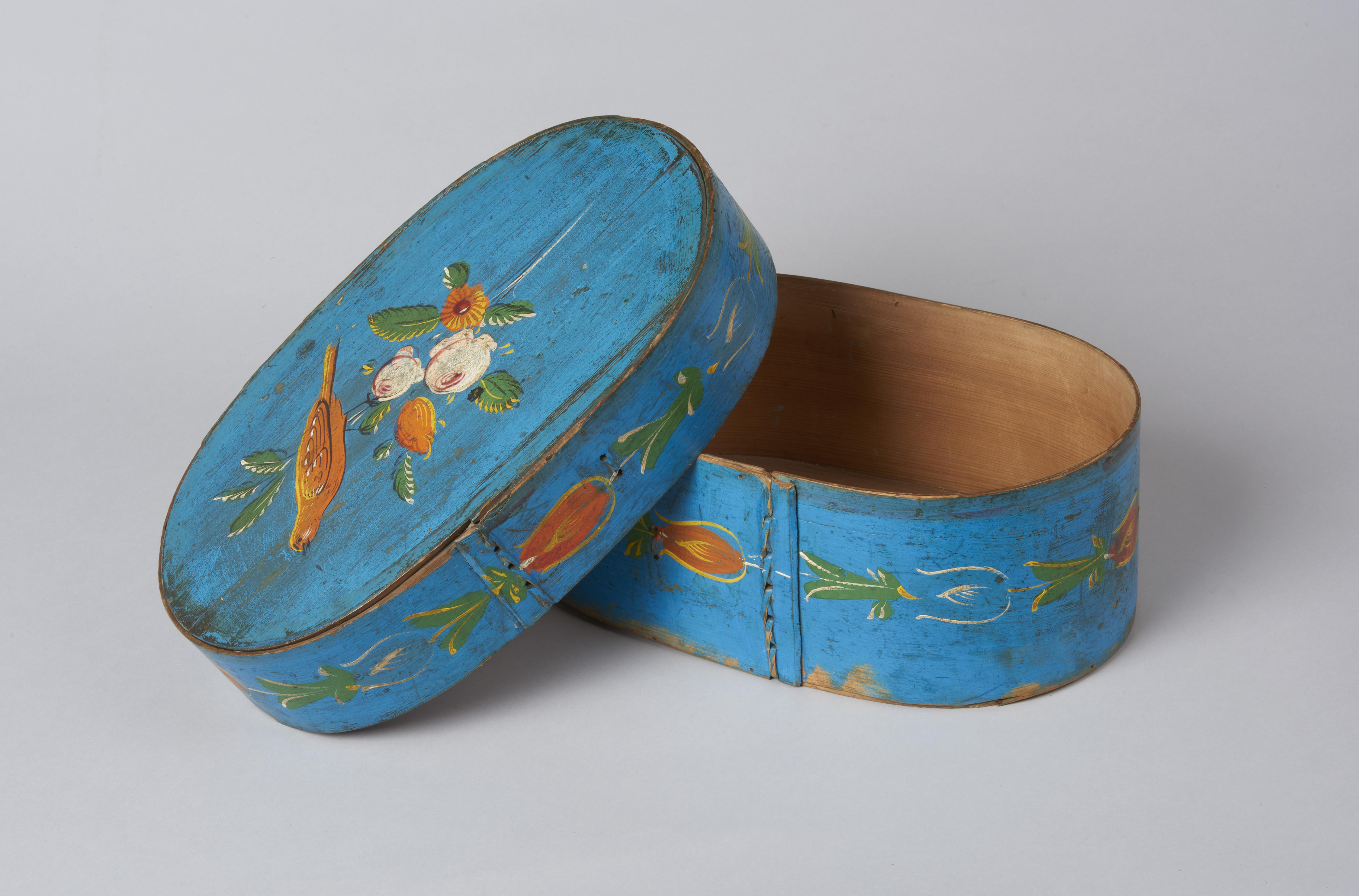 De beschildering van de spanen doos bestaat uit een blauwe basiskleur met op de zijden rondom een bloemenband. Op de bovenzijde staat een afbeelding van een boeket waarin een vogel zit.