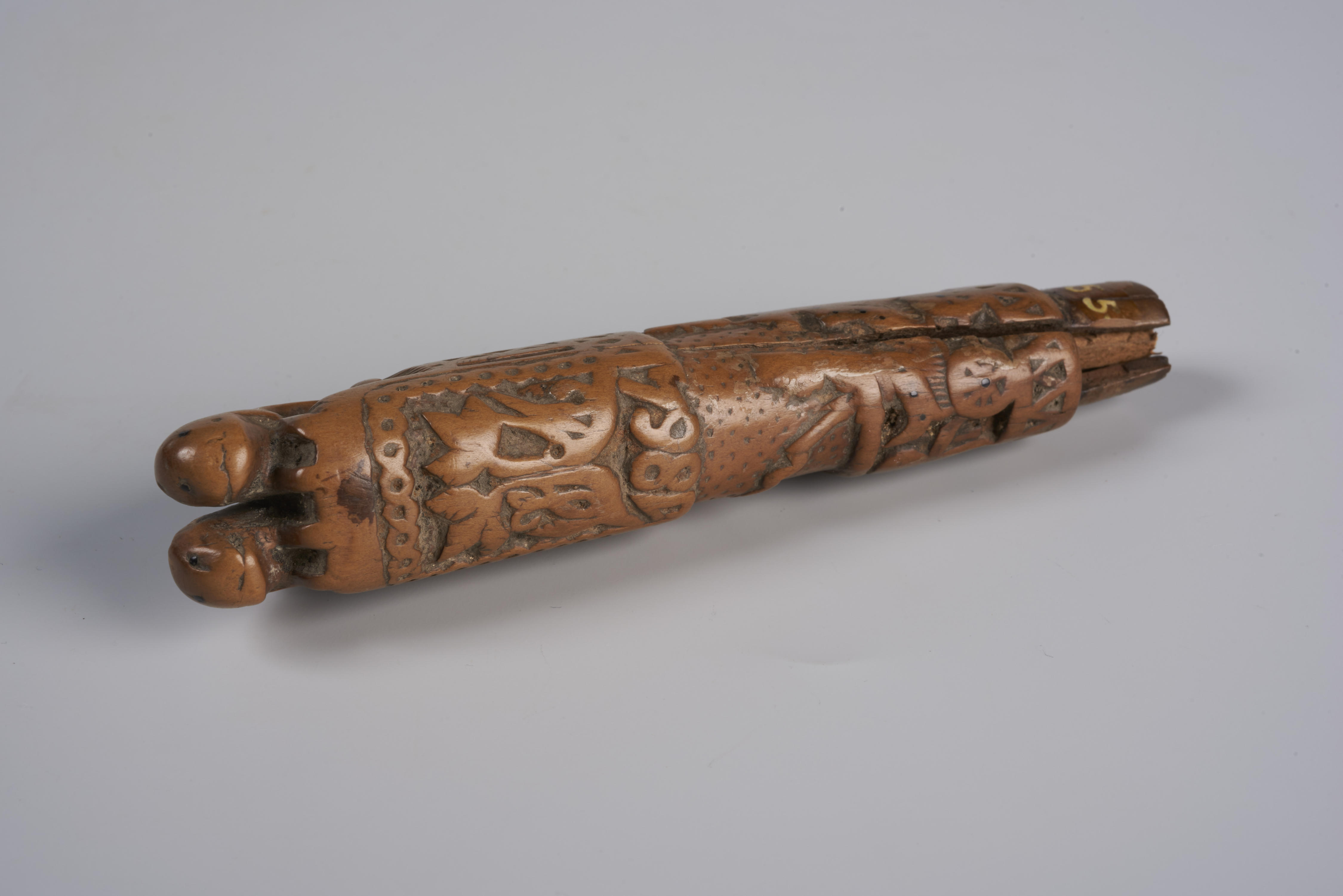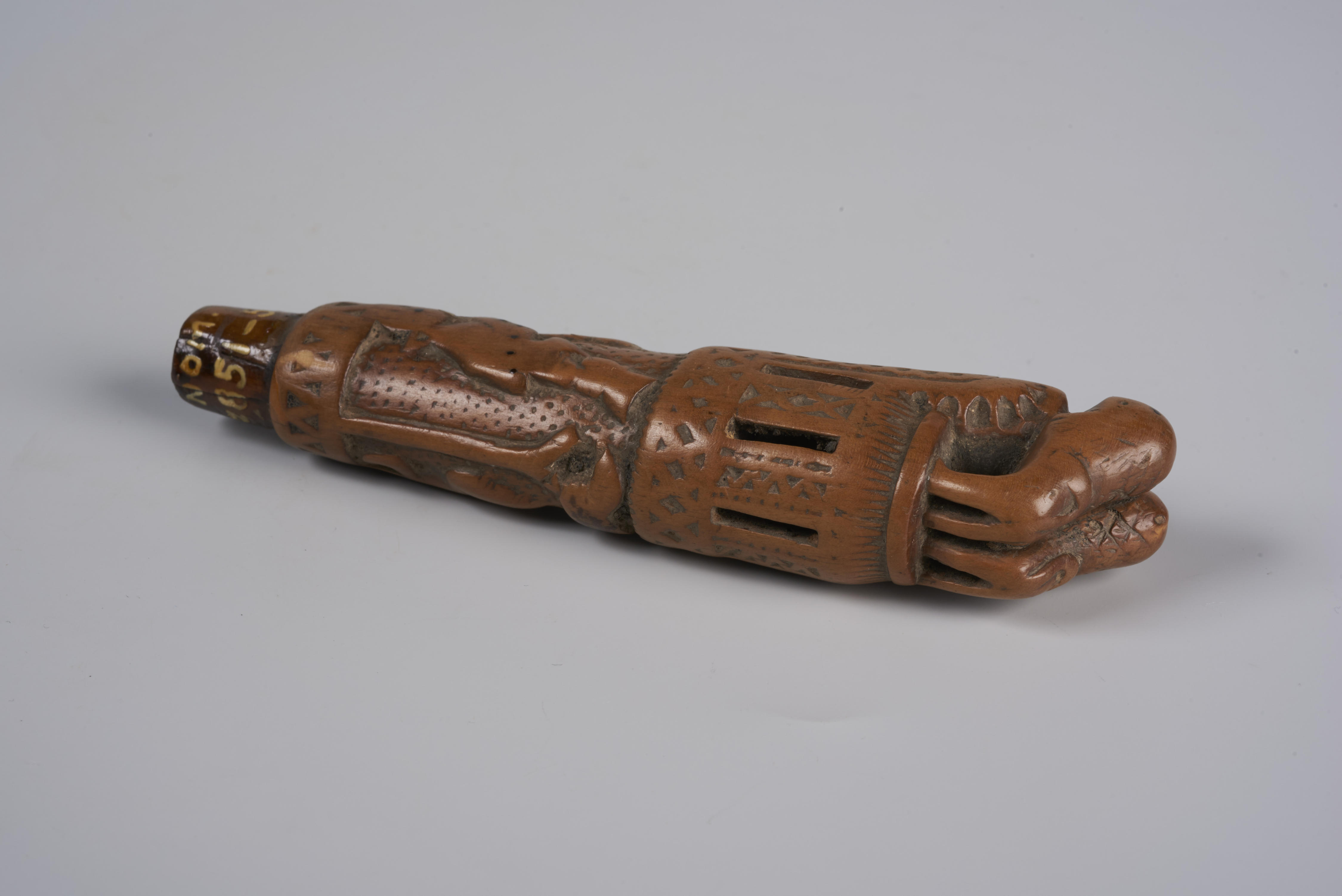 Palmhouten mesheft met de voorstelling van twee landmannen op een wagen. Hierboven zijn twee naar elkaar gewende takken met de initialen 'J.M.' en het jaartal 1864 te zien. Het heft is bekroond met twee opspringende leeuwen.