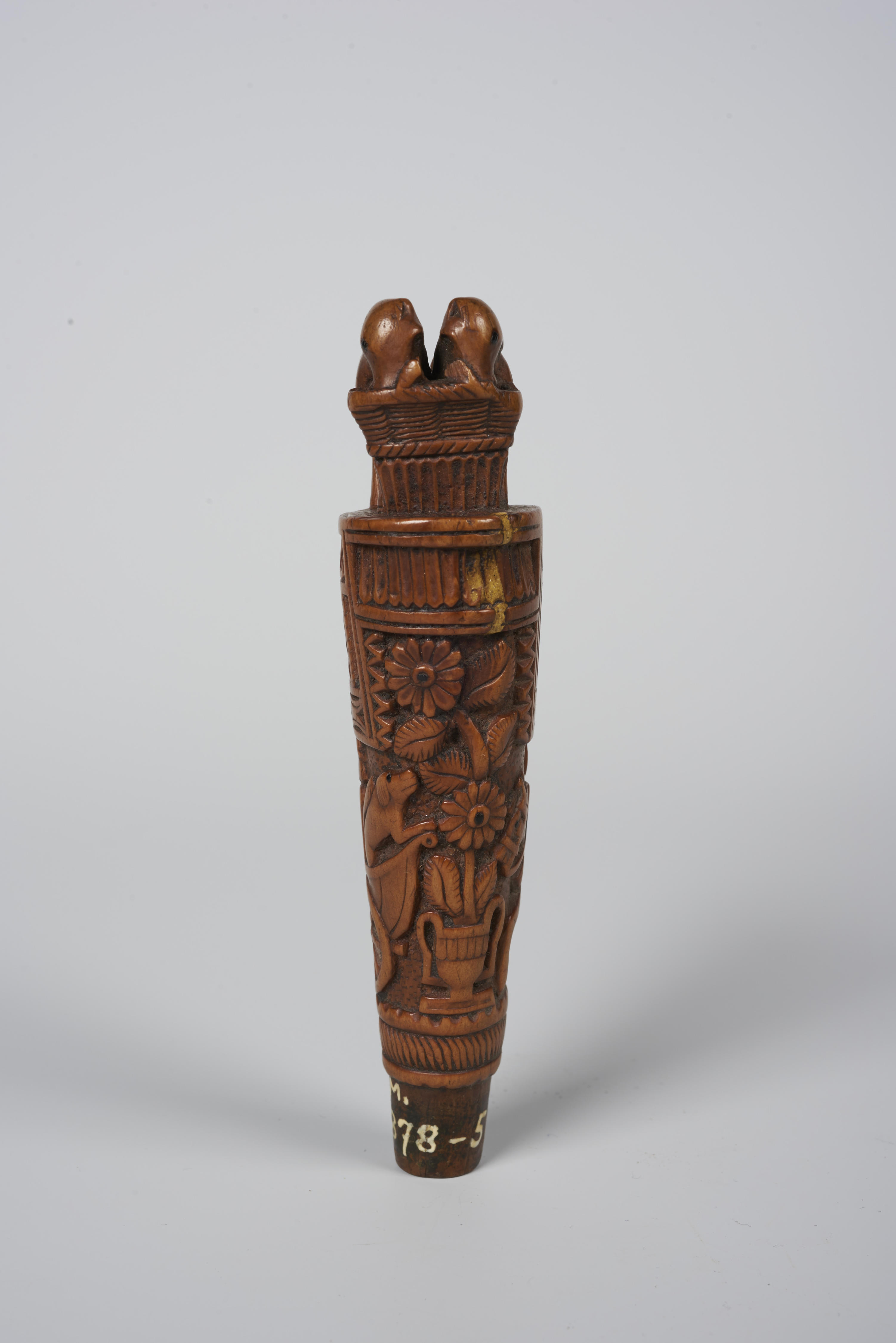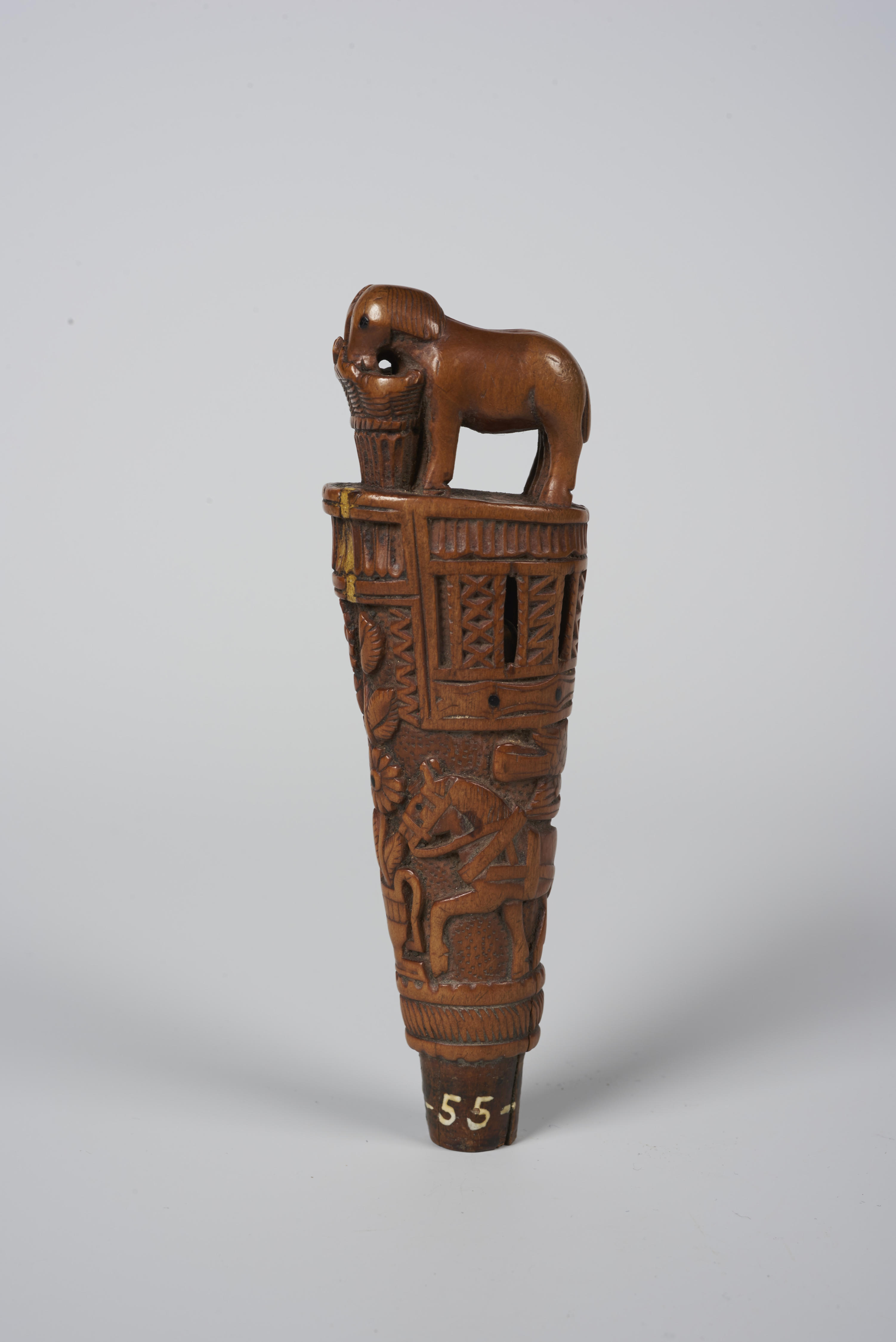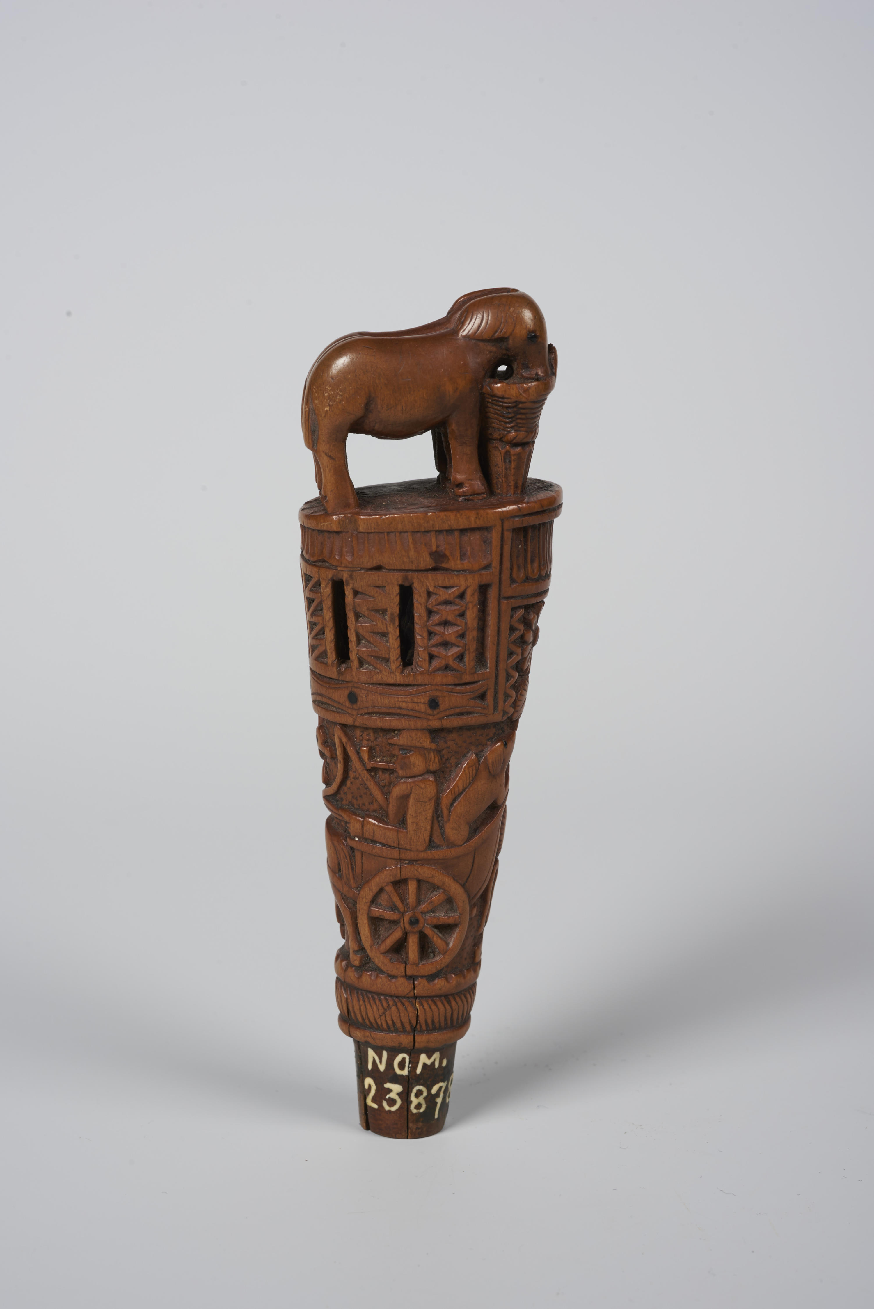 Palmhouten mesheft met de voorstelling van een kar waarop een landman zit. Achter op de kar zit een hond. Het heft is verder besneden met een vaas met bloemen en een vliegende vogel. Het is bekroond met twee staande paarden die uit een voermand eten.