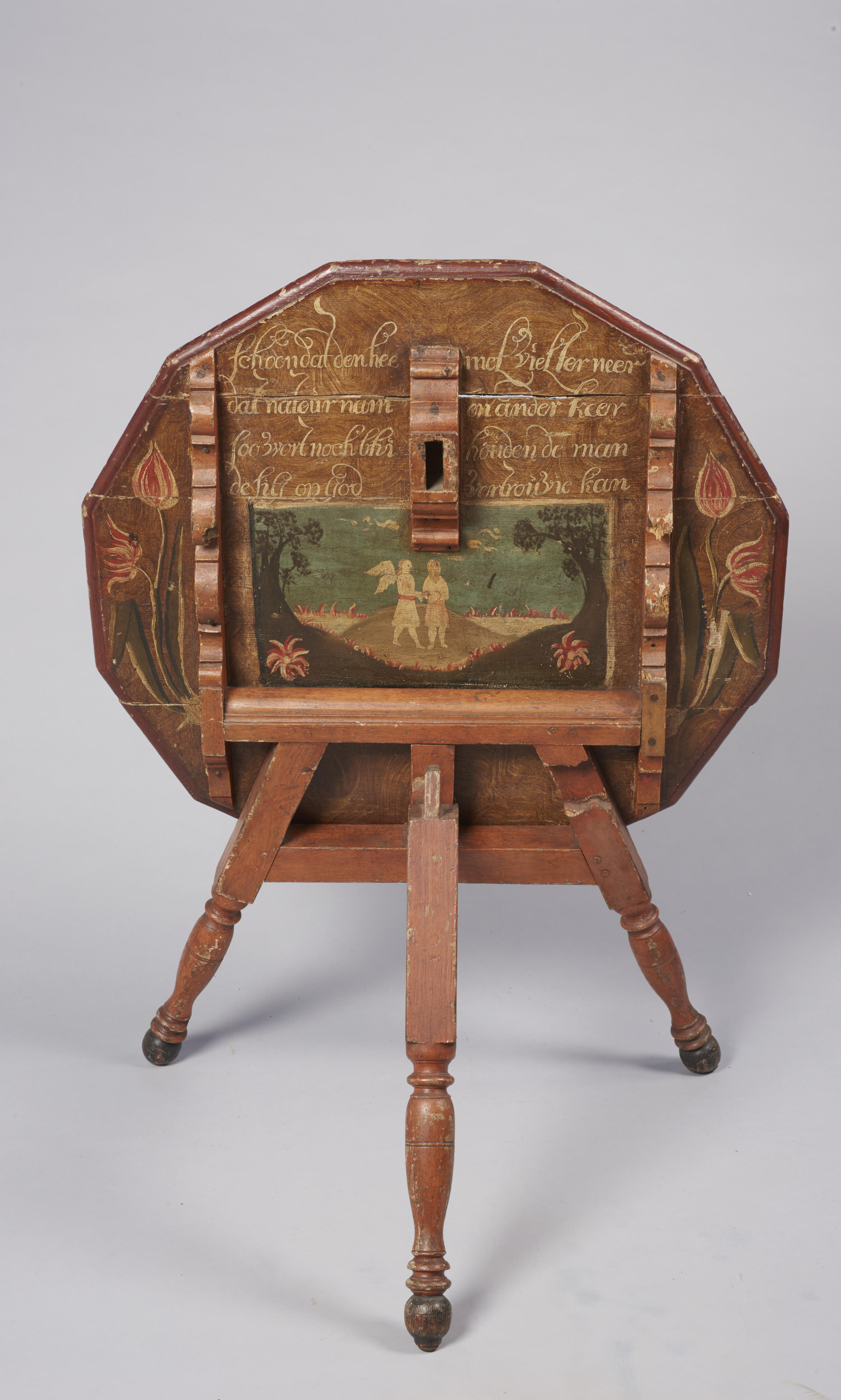 Houten klaptafel, aan de onderzijde van het blad beschilderd met een Bijbelse voorstelling: de bekendmaking aan Noach.