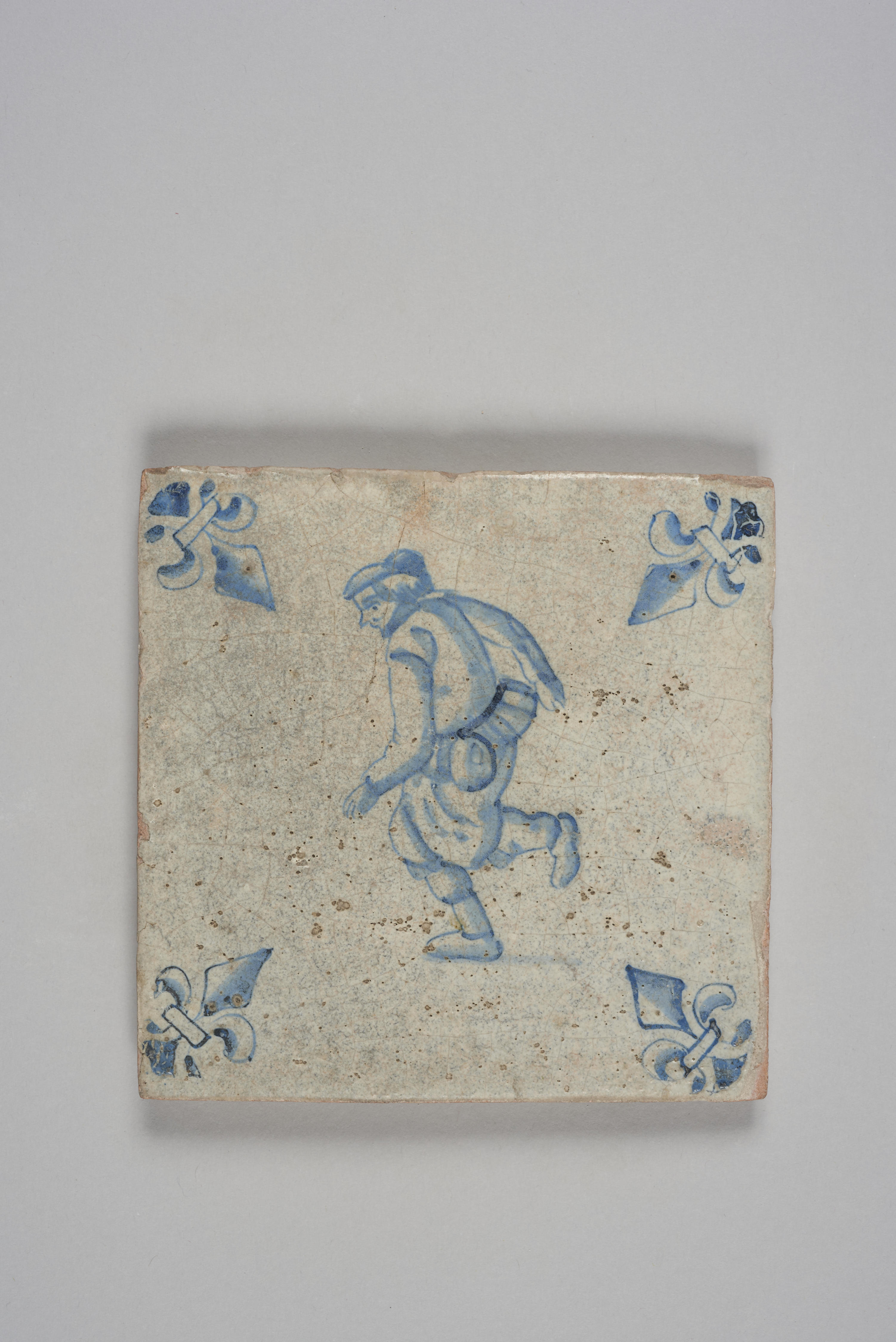 Wandtegel met een afbeelding van een rennende man met een buidel; blauw; hoekmotief: lelie.