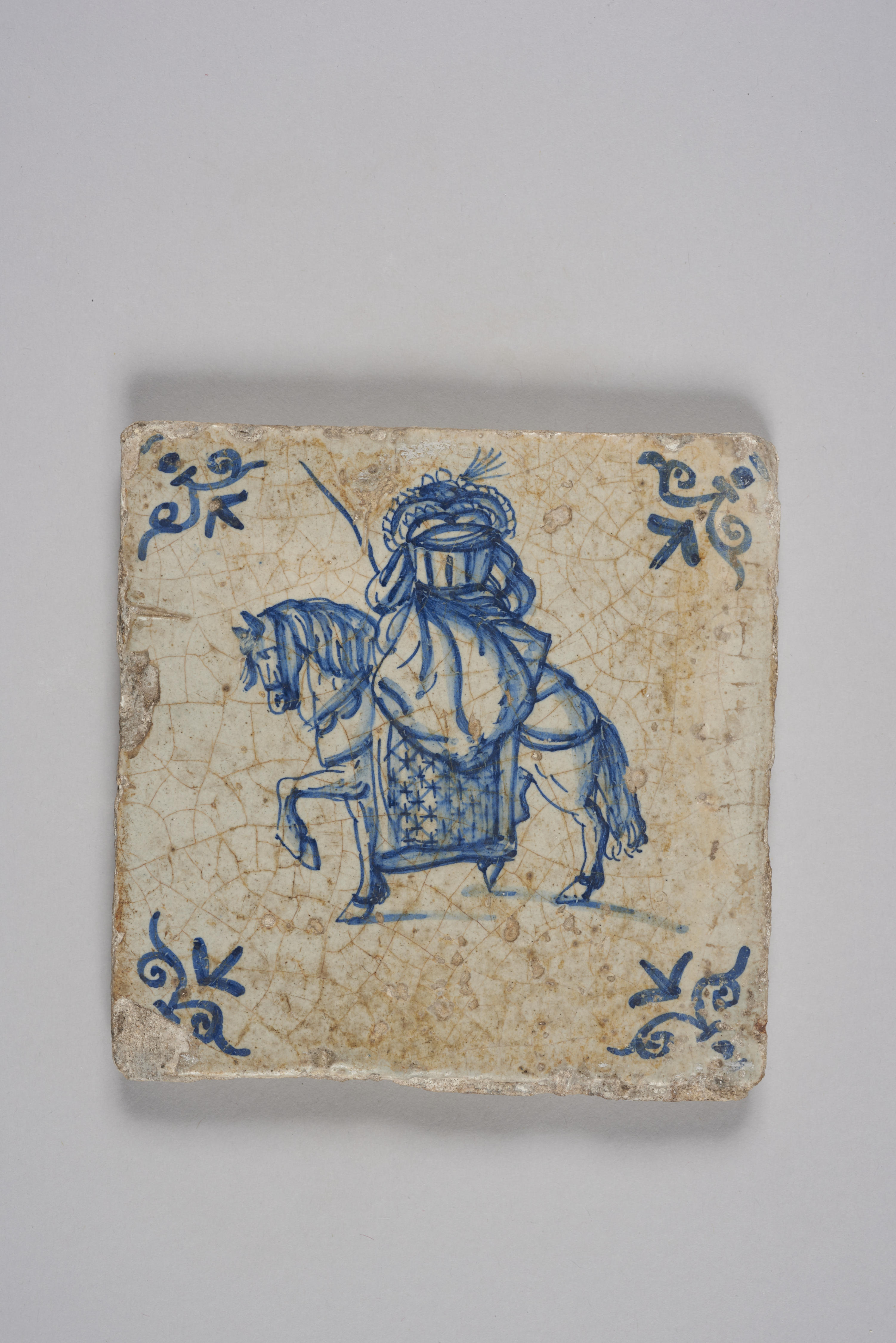 Wandtegel met afbeelding vrouw op paard, 1600–1700