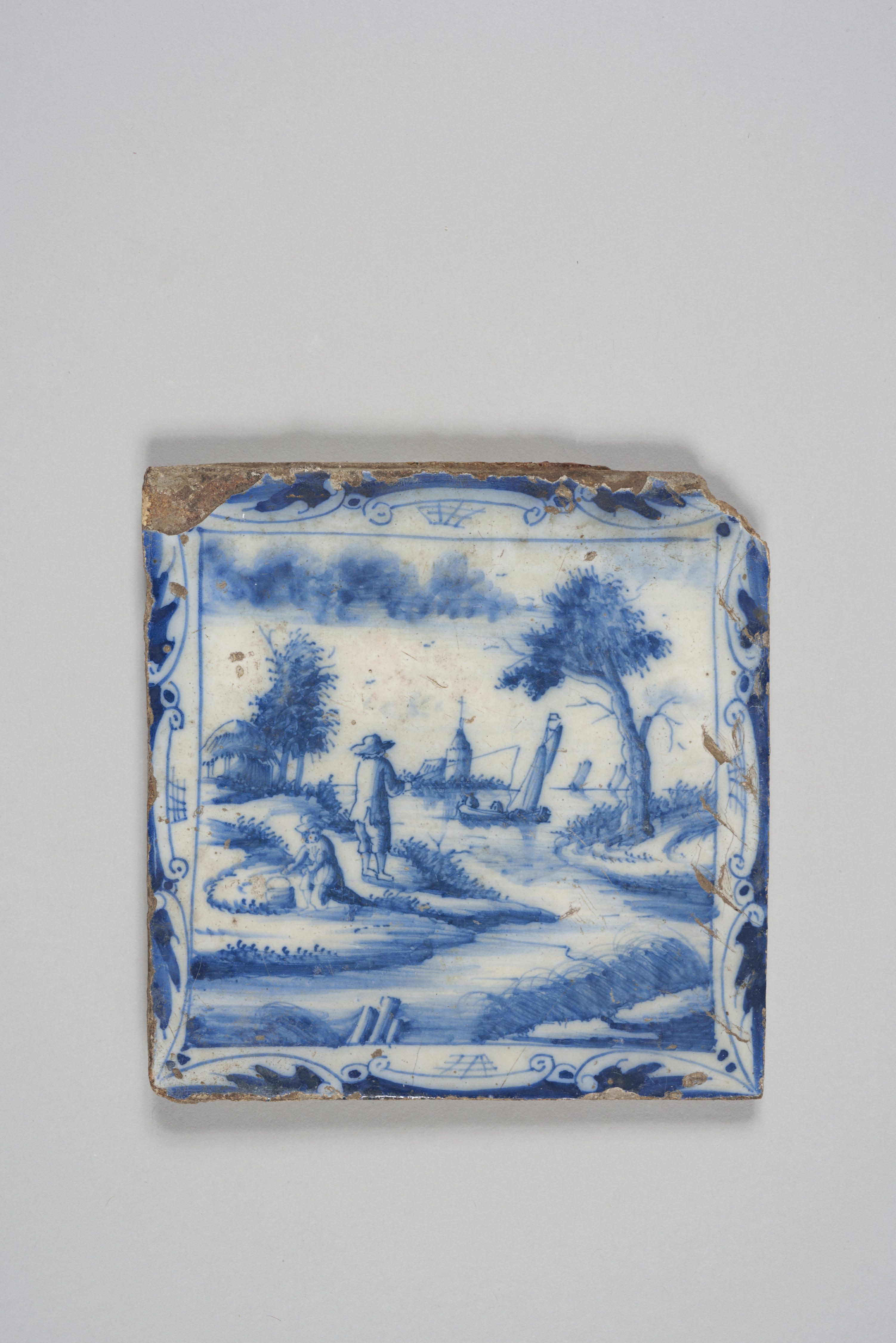 Wandtegel met afbeelding landschap in vierkant, 1770-1800 of 1890–1920