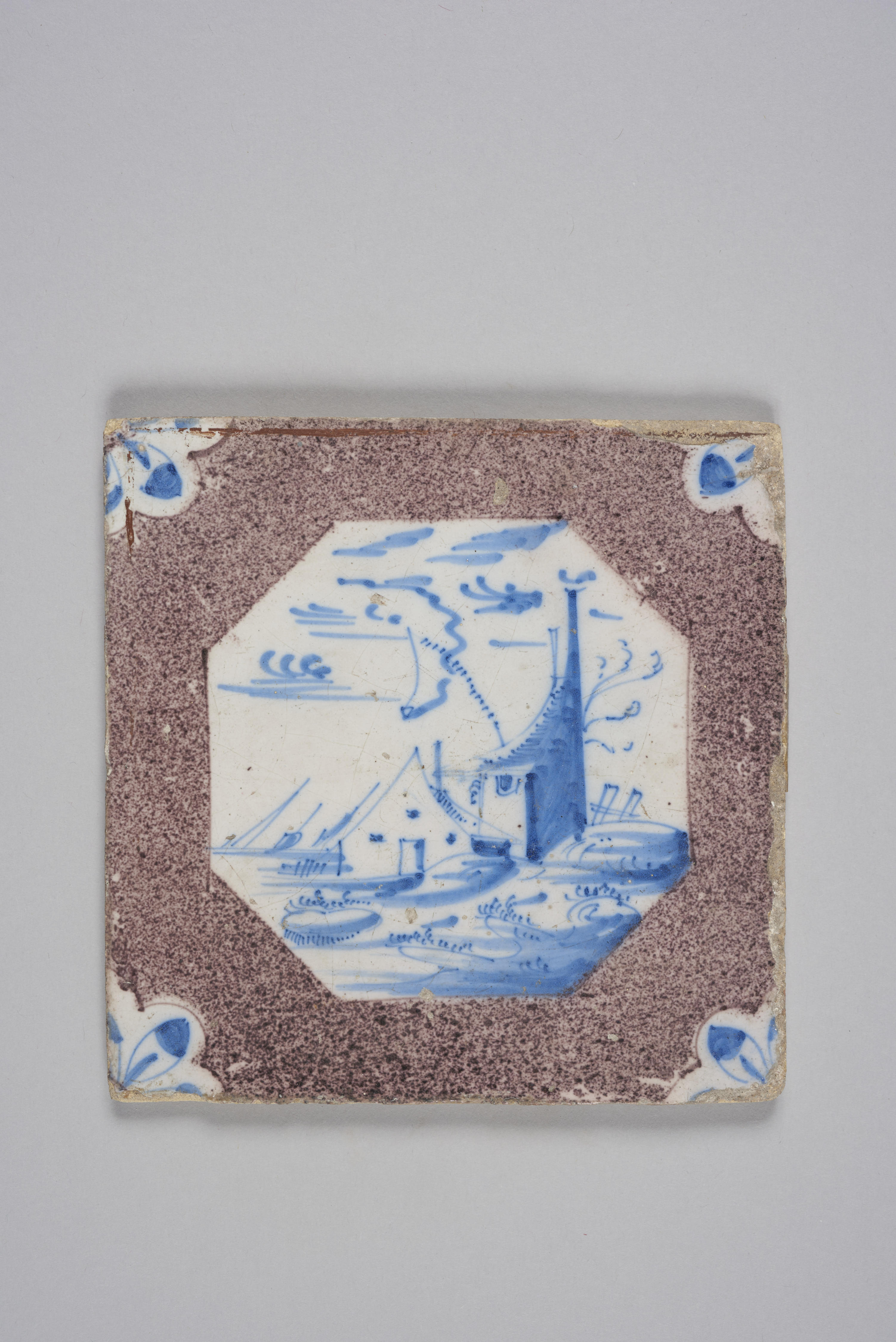 Wandtegel met een afbeelding van een landschap in een achtkant op een gesprenkeld fond; blauw geschilderd, paars gesprenkeld; hoekmotief: uitgespaarde kwartrozet.