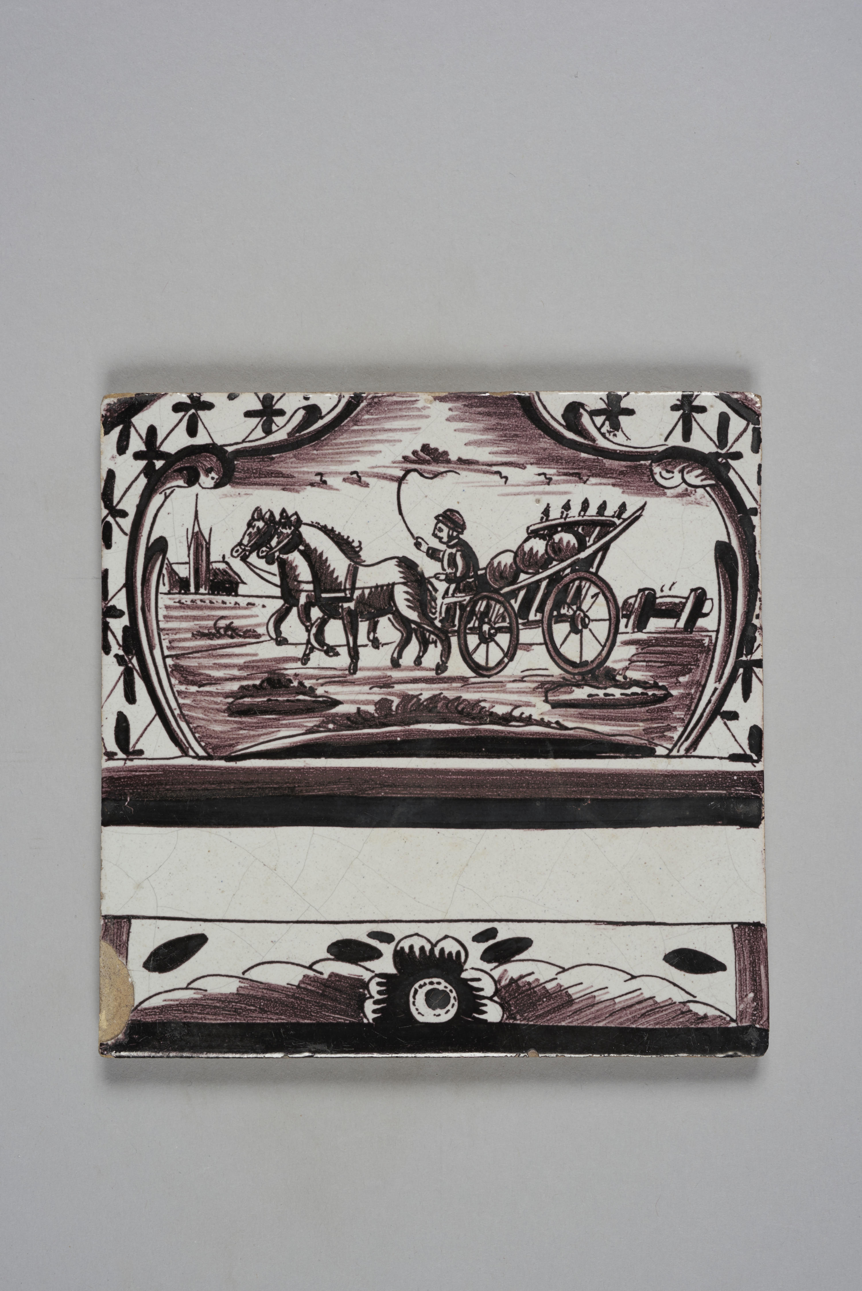 Wandtegel met een afbeelding van een landschap met een boer, kar en paarden; mangaanpaars. De tegel is deel van een tegeltableau of deel van een voetstuk van een bloempot.