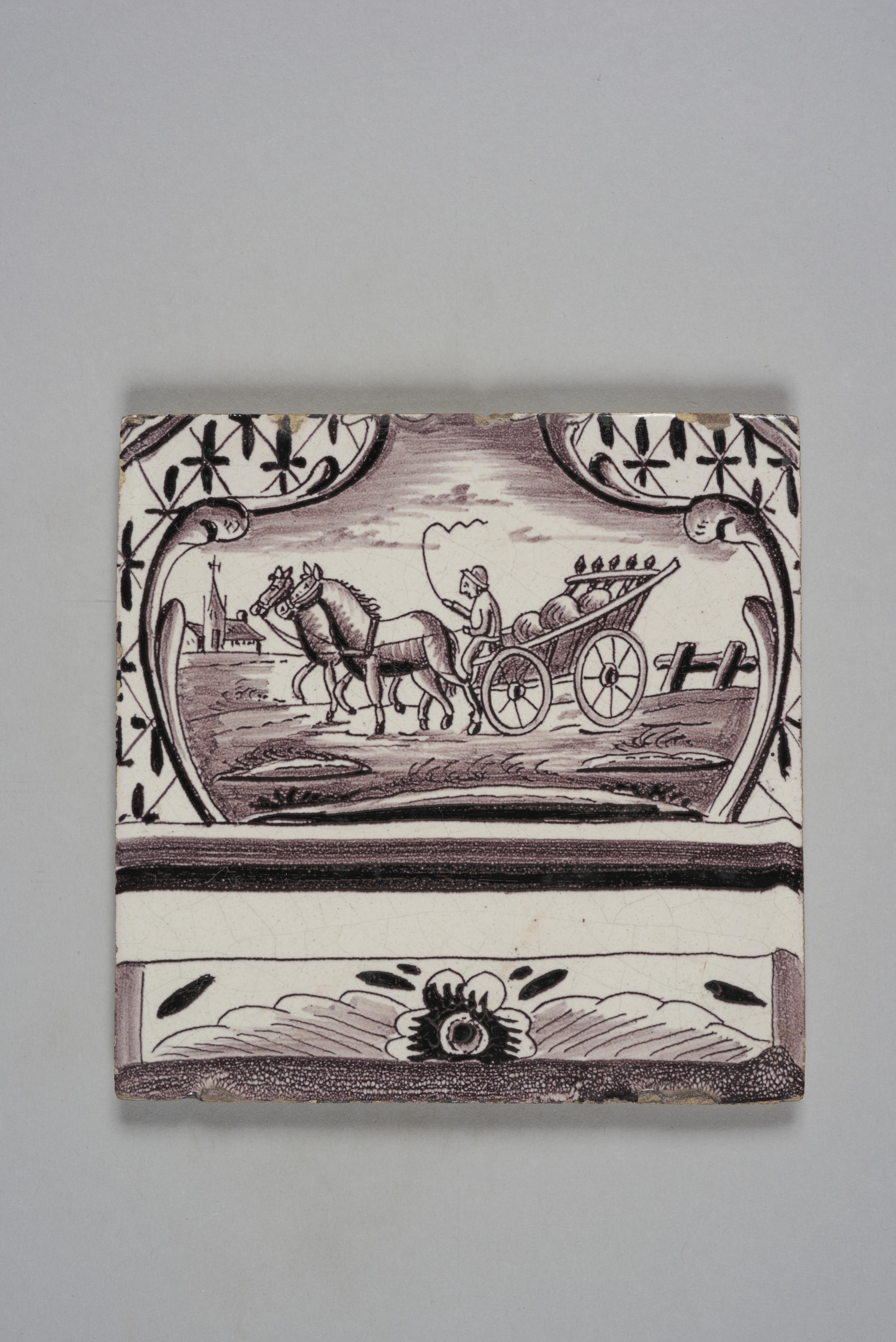 Wandtegel, deel van een bloempottableau. Op de tegel staat een cartouche met een voorstelling van een man met paarden en een boerenwagen.