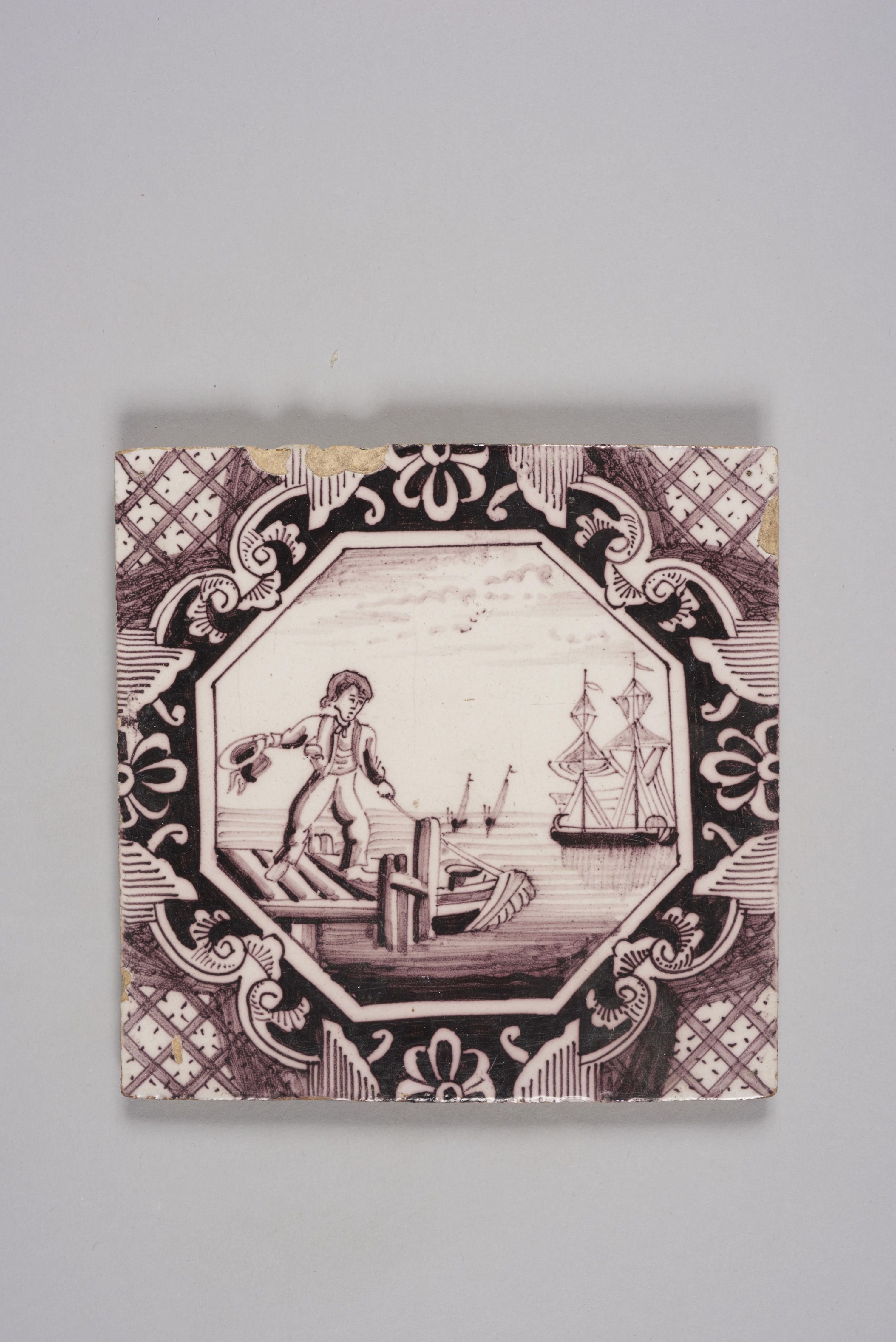 Wandtegel met afbeelding landschap in achtkant, 1740–1920