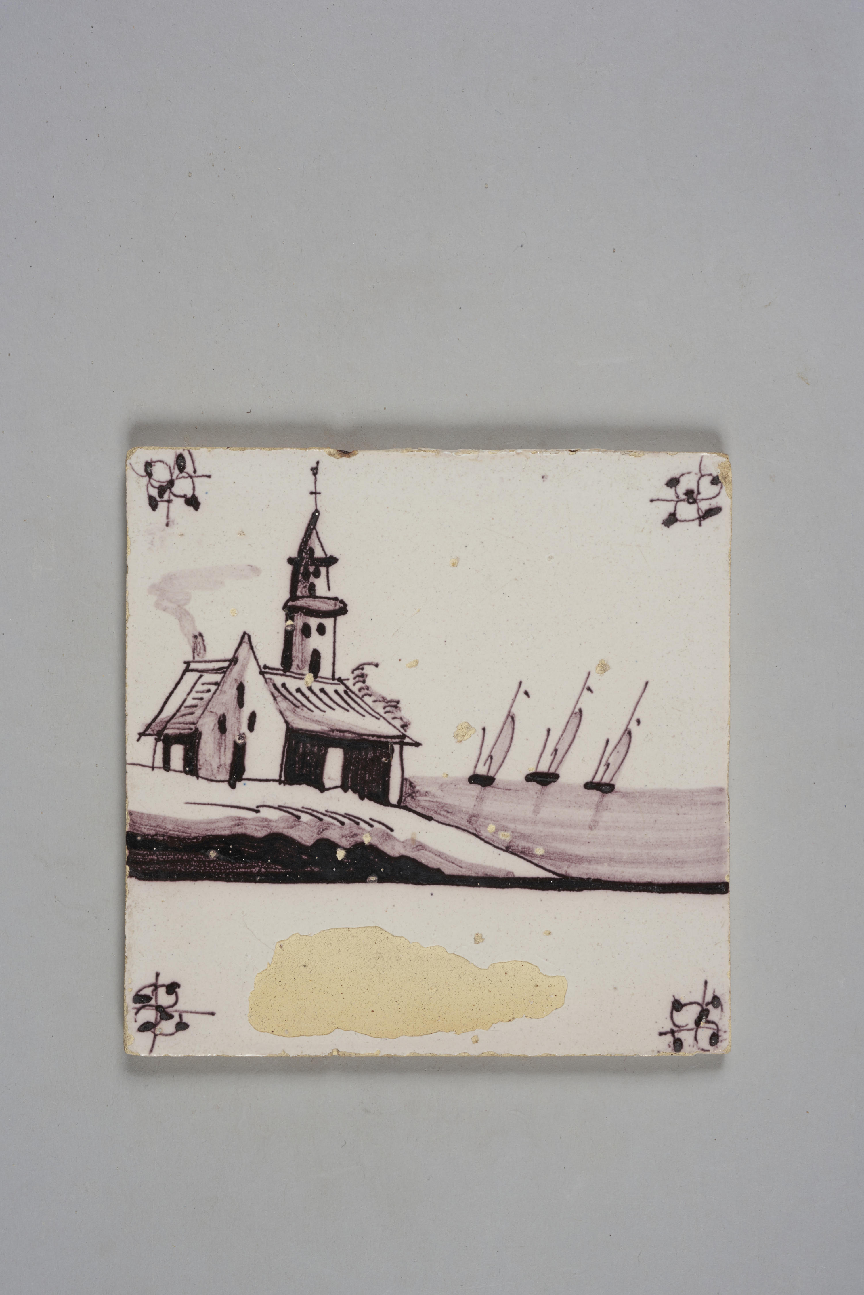 Wandtegel met een afbeelding van een landschap; mangaanpaars; hoekmotief: spin.