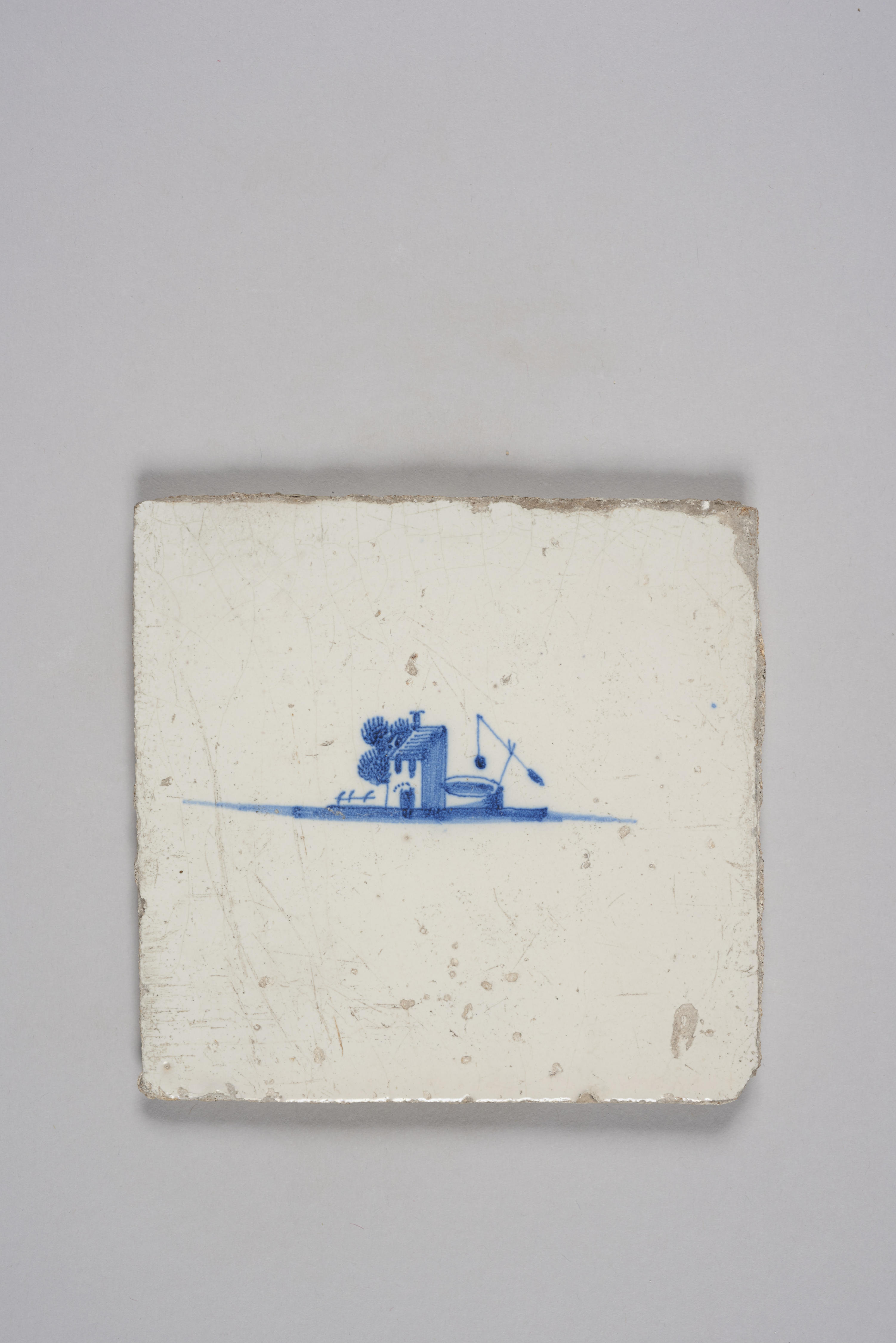 Wandtegel met een afbeelding van een gebouw en waterput in een landschap; blauw.