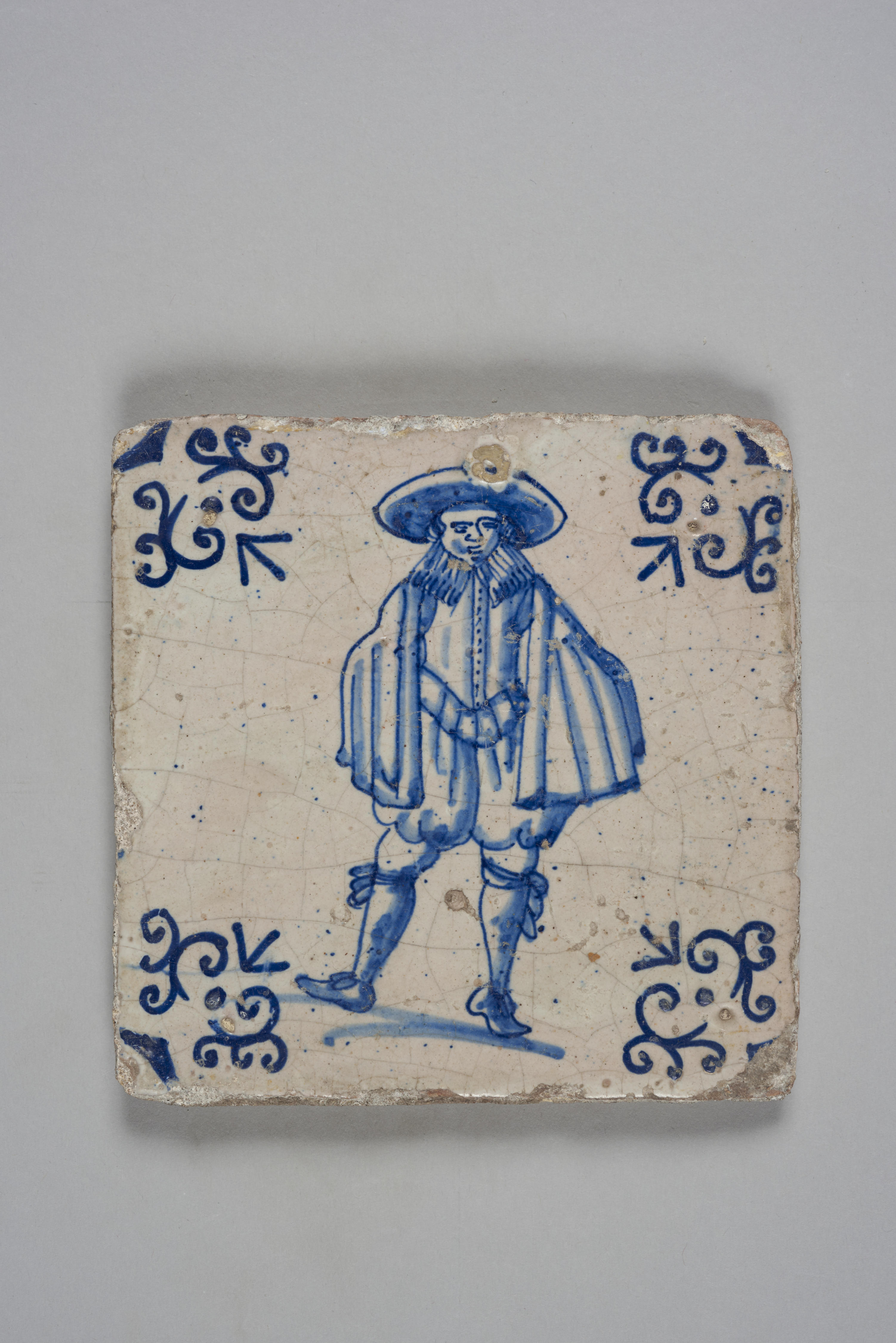 Wandtegel met een afbeelding van een voorname man; blauw; hoekmotief: voluut.