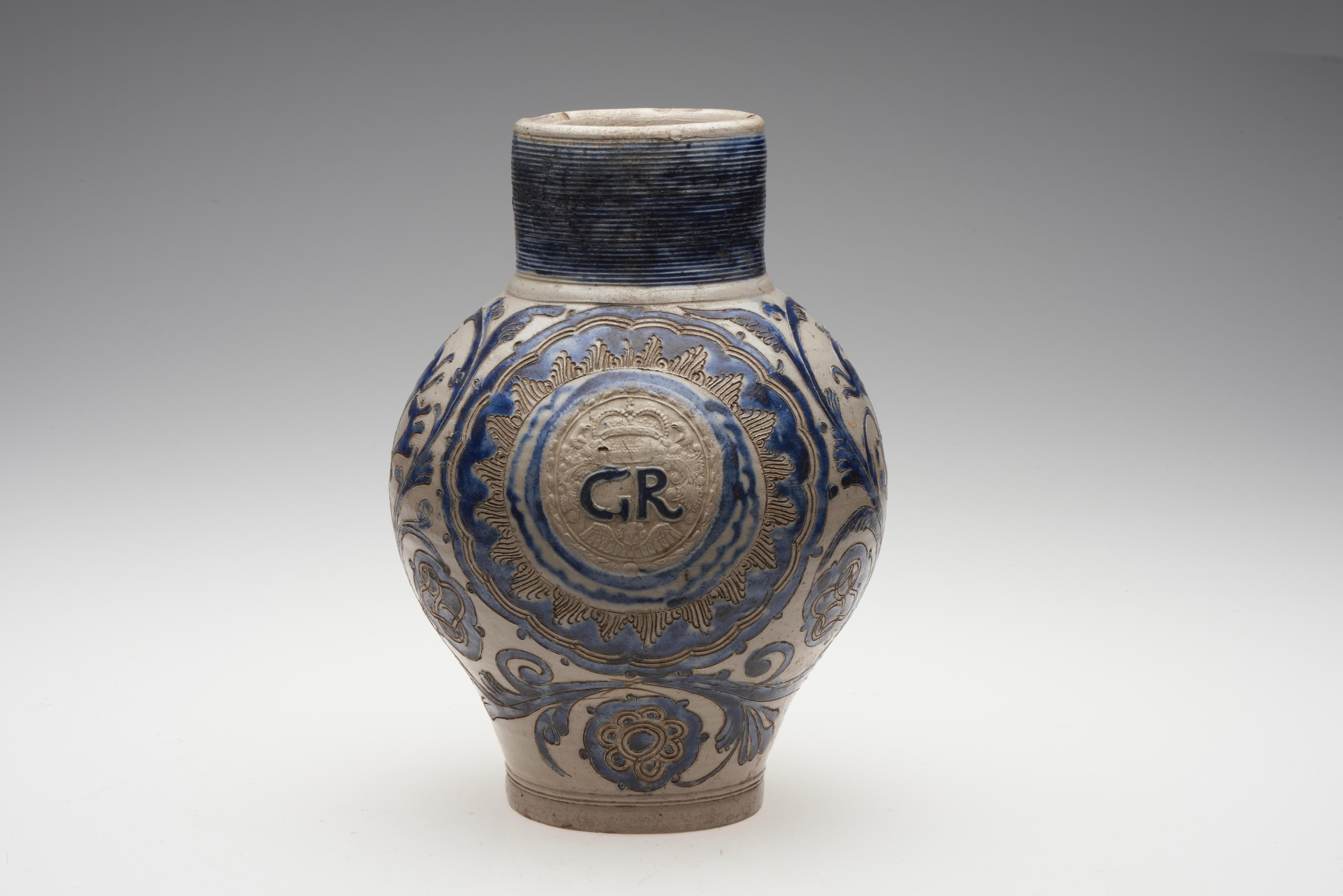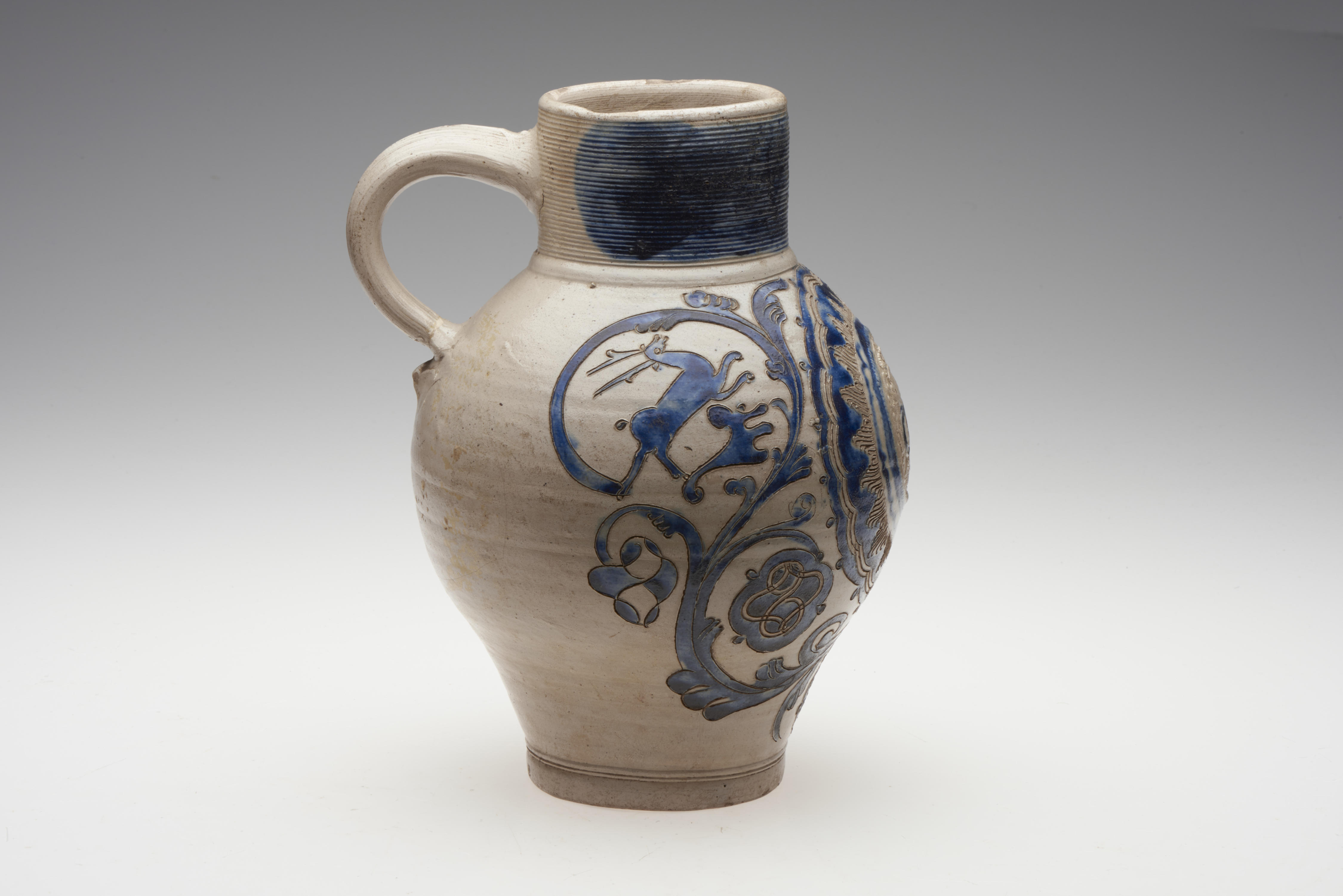 Aardewerken kruik met een opvallend hoge kraagwand. De vormen en versieringen zijn kenmerkend voor het Westerwalder aardewerk. De herten op deze kruik zijn, zoals dat gebruikelijk is bij Westerwalder kruiken uit deze periode, afgebeeld met bloemenranken. Dergelijk kruiken of potten werden vooral geëxporteerd om te dienen als pronkstuk. Vermoedelijk was deze kruik voor de Engelse ...
