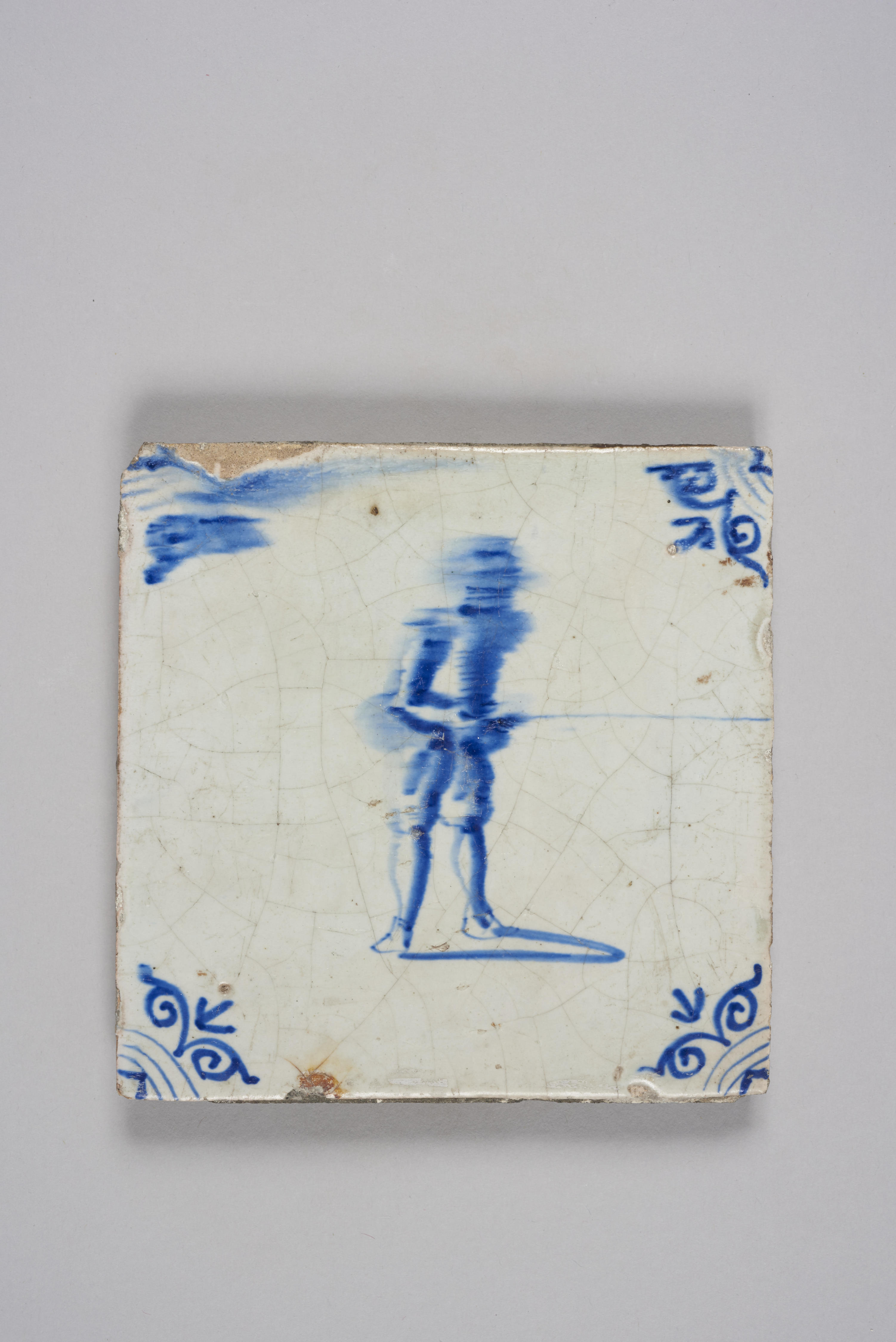 Wandtegel met een afbeelding van een man; blauw; hoekmotief: ossenkop.