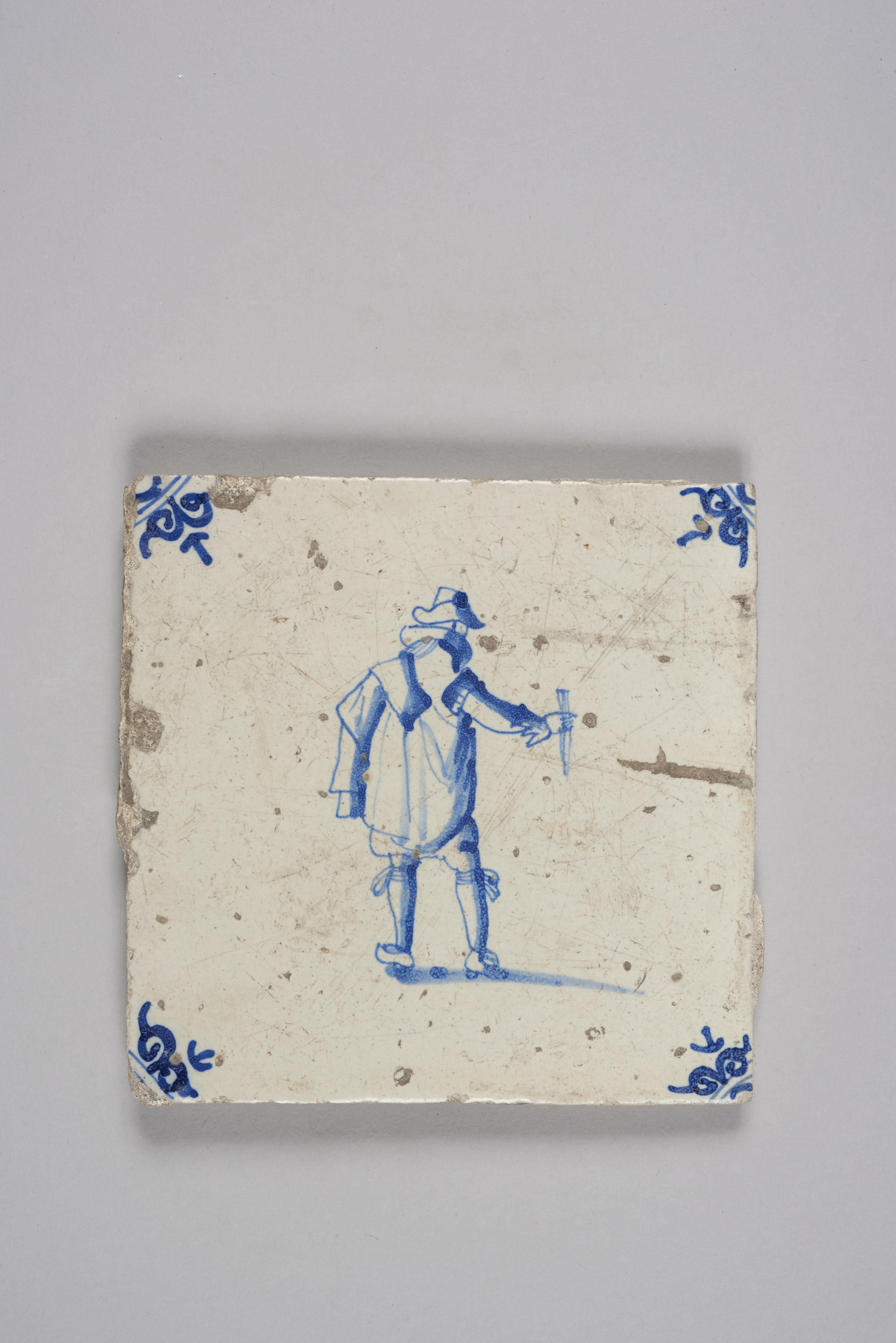 Wandtegel met een afbeelding van een man met een onbekend voorwerp in zijn hand; blauw; hoekmotief: ossenkop.