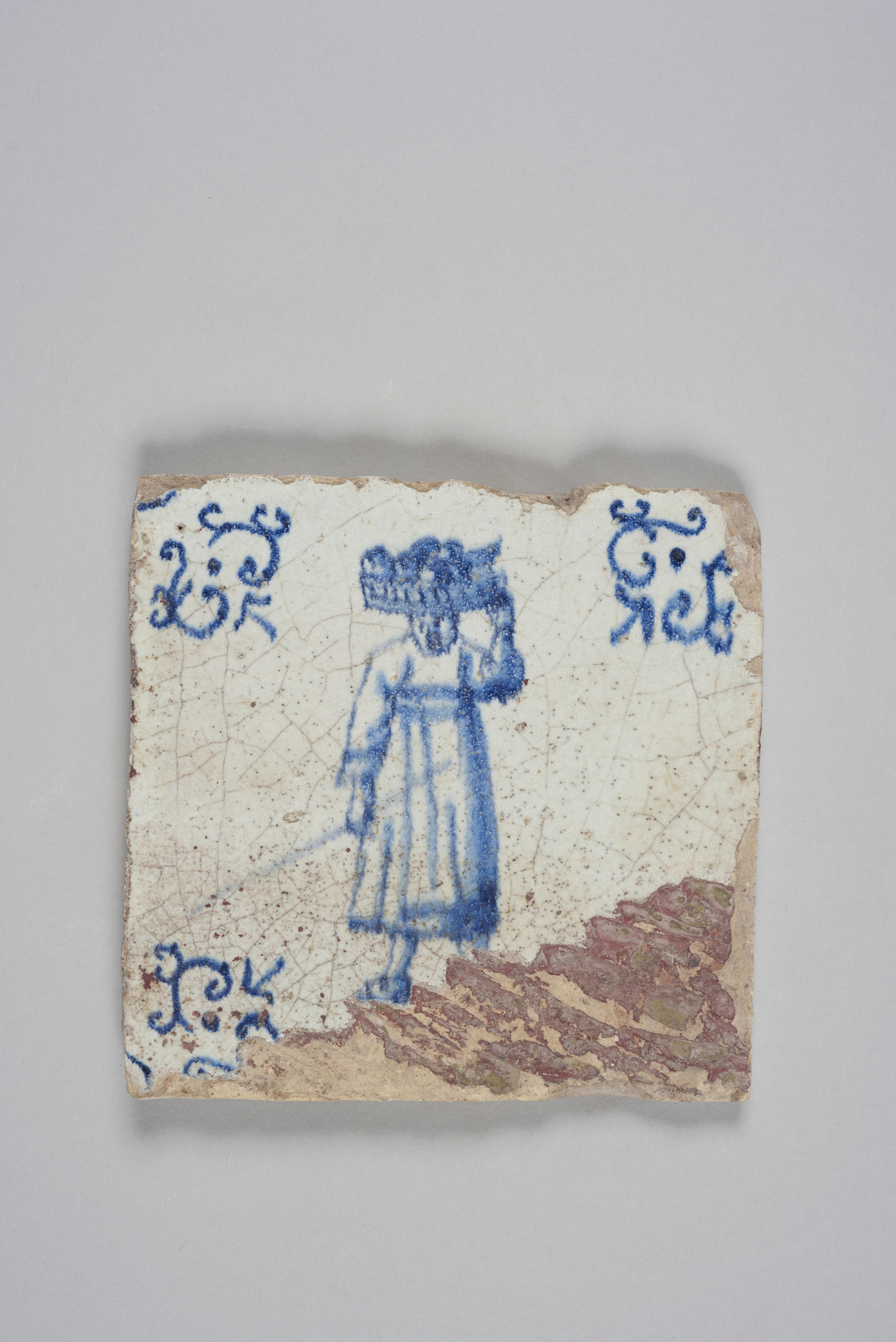 Wandtegel met afbeelding vrouw met mand op hoofd, 1620–1660