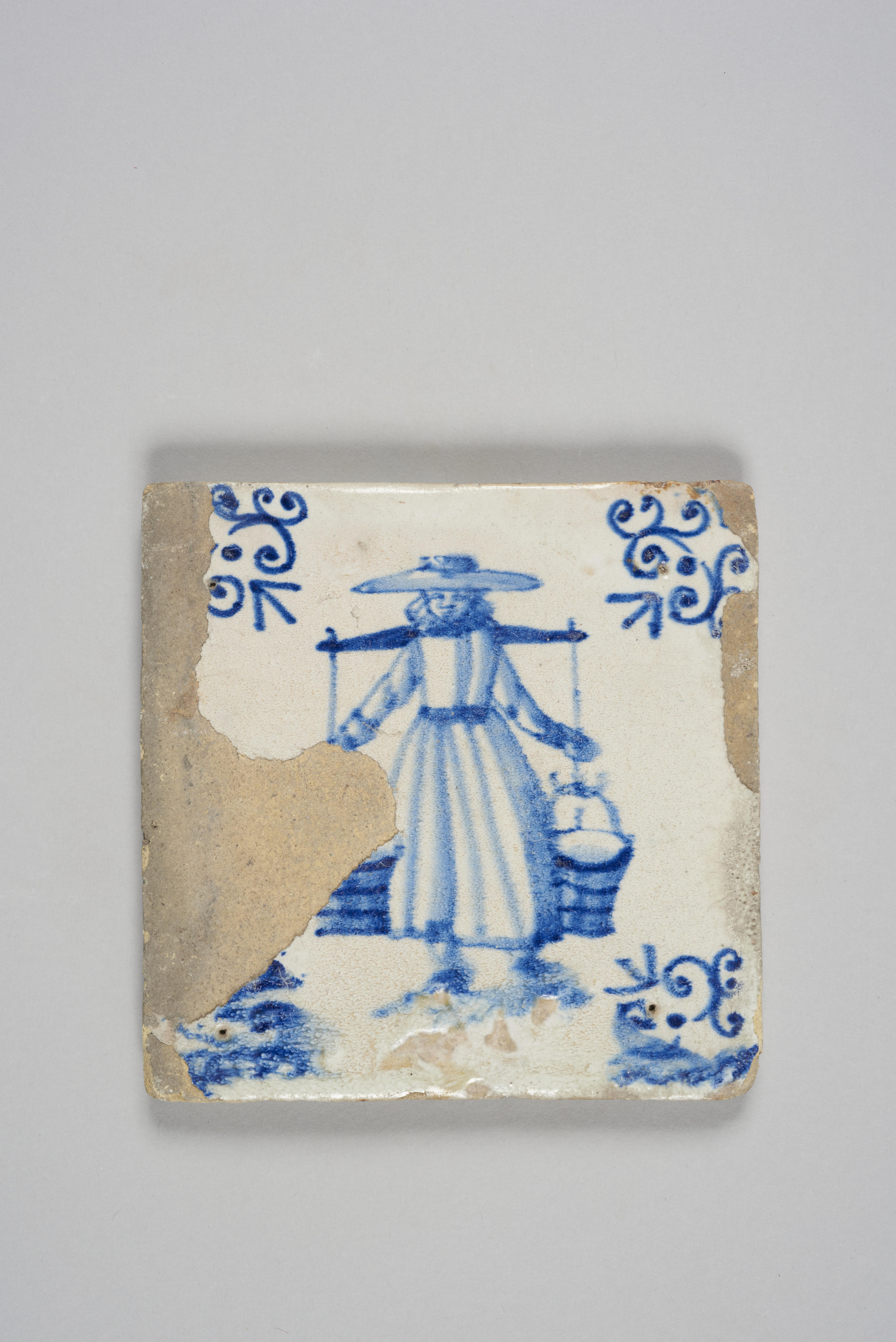 Wandtegel met afbeelding vrouw met juk en emmers, 1625–1650