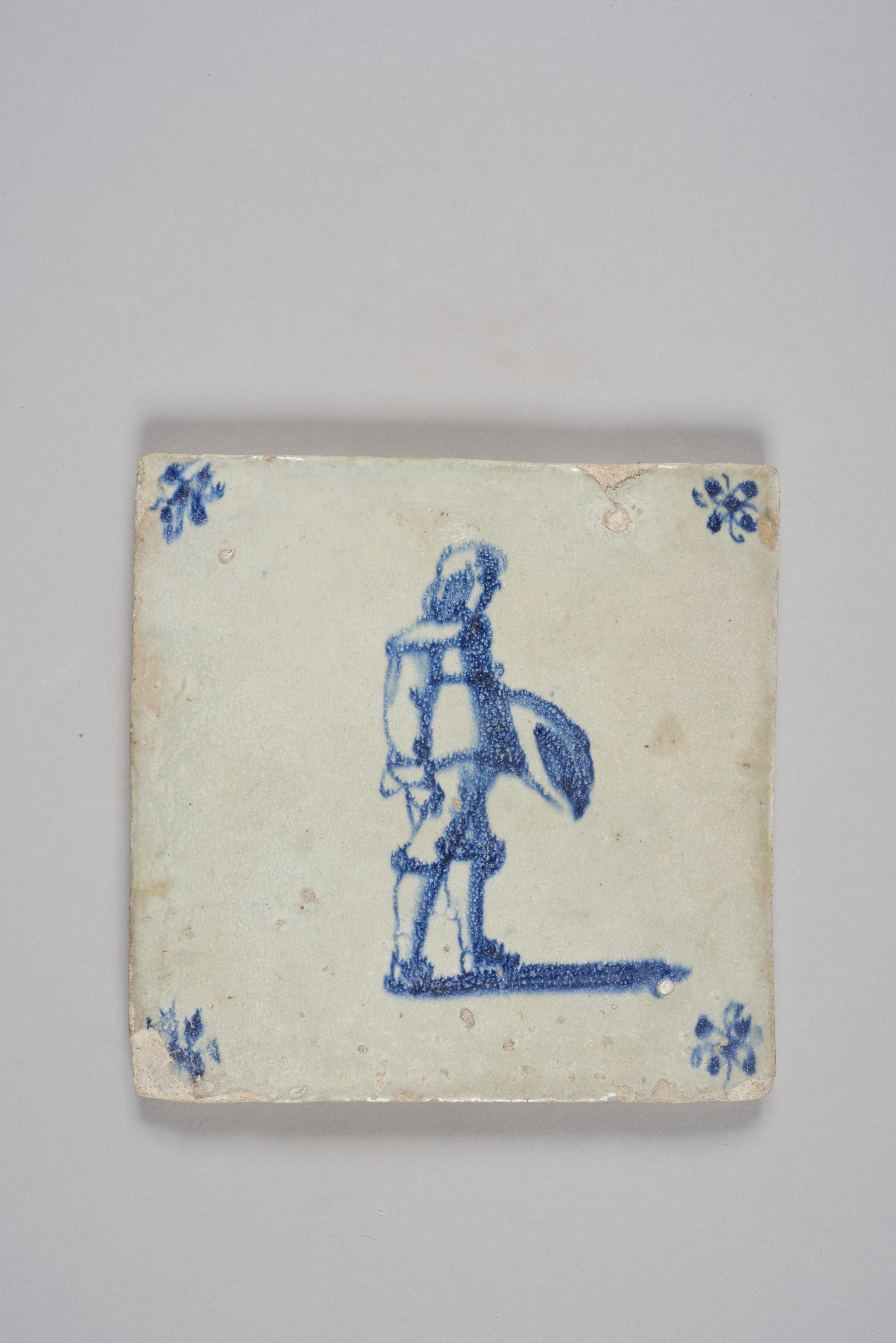 Wandtegel met een afbeelding van een man met een hoed in zijn hand, mogelijk een bedelaar; blauw; hoekmotief: spin.