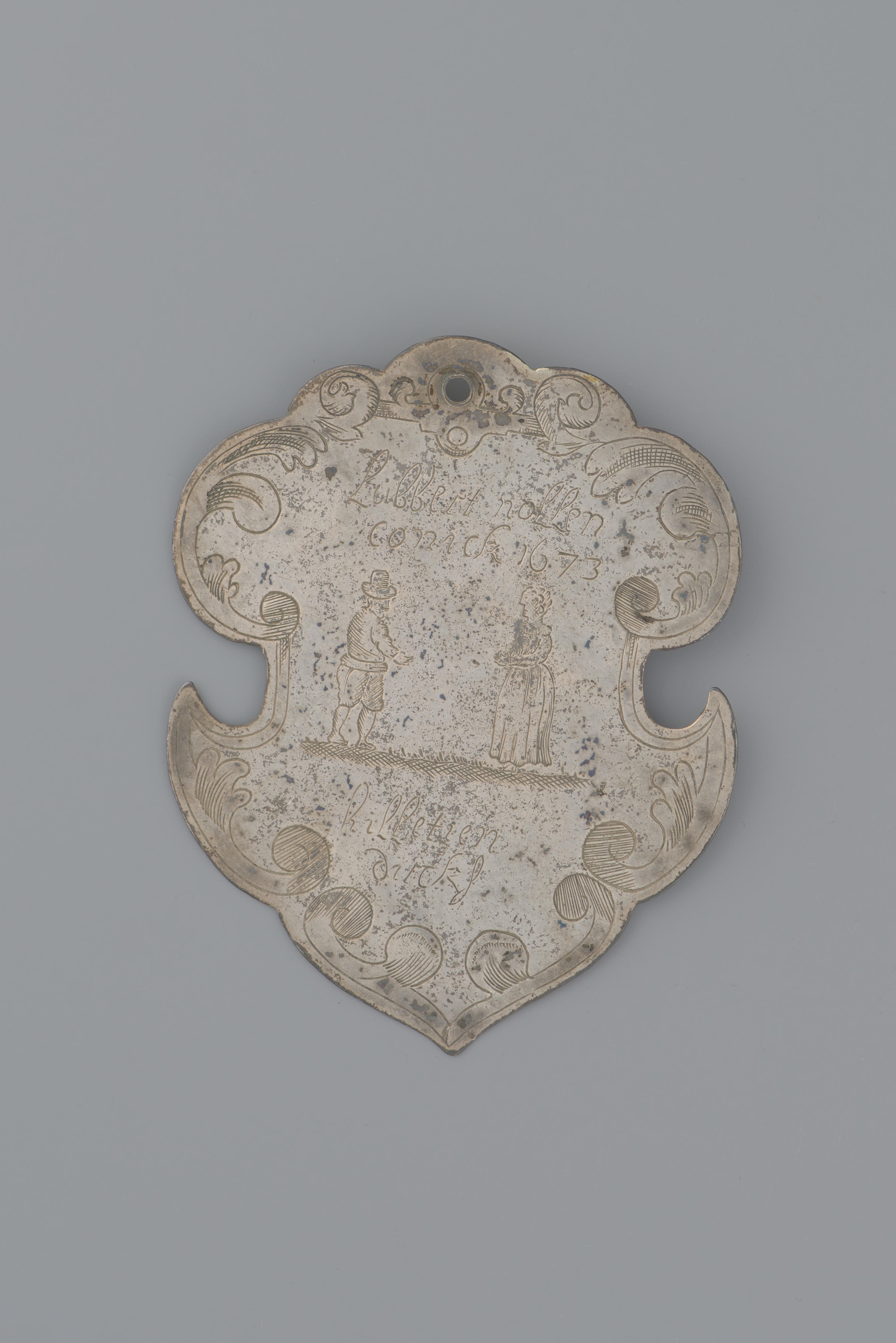 Zilveren koningsplaat. Het schild is aan één zijde gegraveerd met onderaan een schaafbank. Hierop liggen een blokschaaf, hamer, beitel en drijfhoutje. Boven de bank zijn een zaag met gebogen handvat, een blokschaaf met hieronder een dubbele pijl en een bijl afgebeeld. Boven de afbeeldingen staat de inscriptie: 'Lubbert nollen conick'. Langs de rand zijn krulversieringen ...