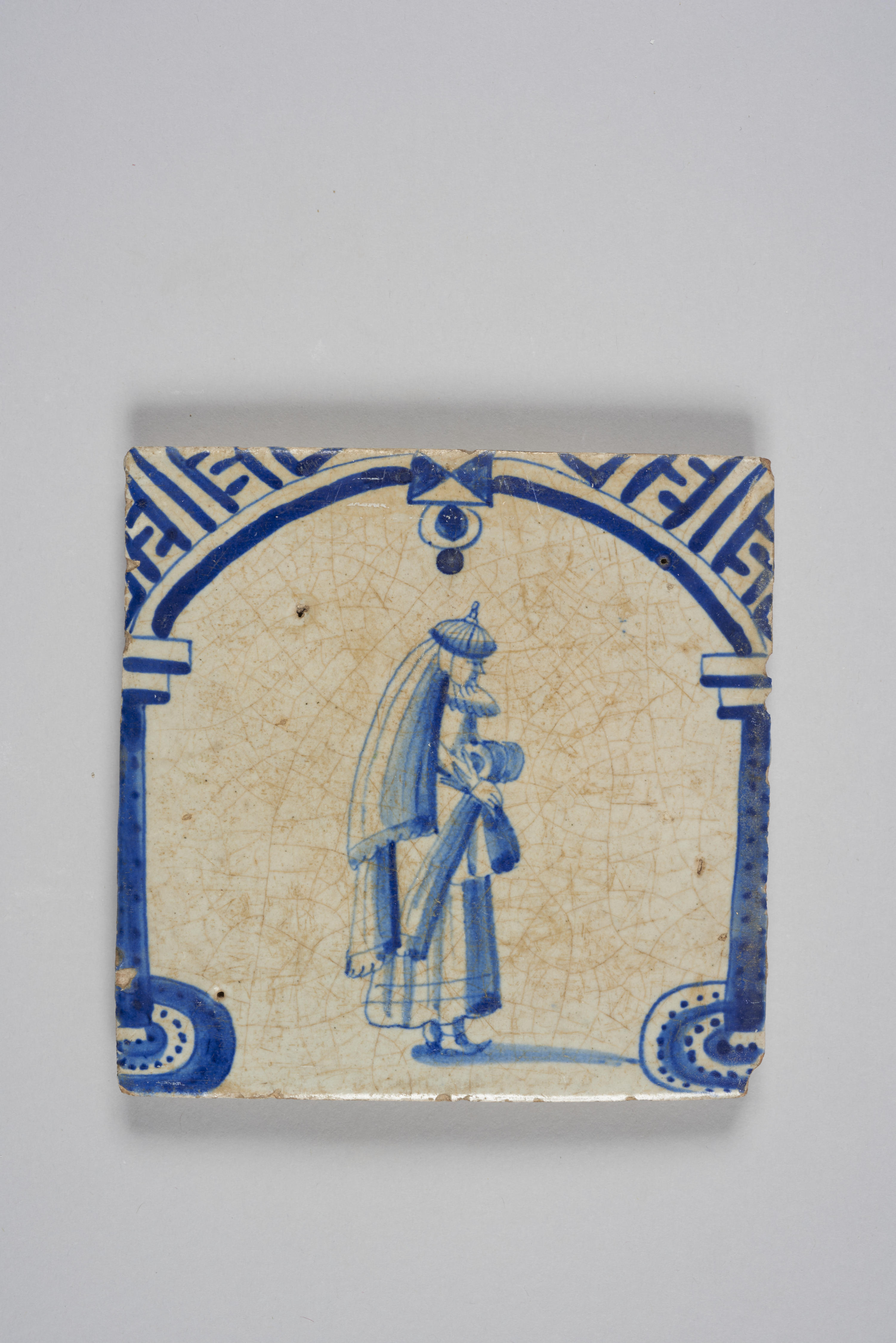 Wandtegel met een afbeelding van een vrouw onder een boog; blauw; hoekmotief: meanders.
