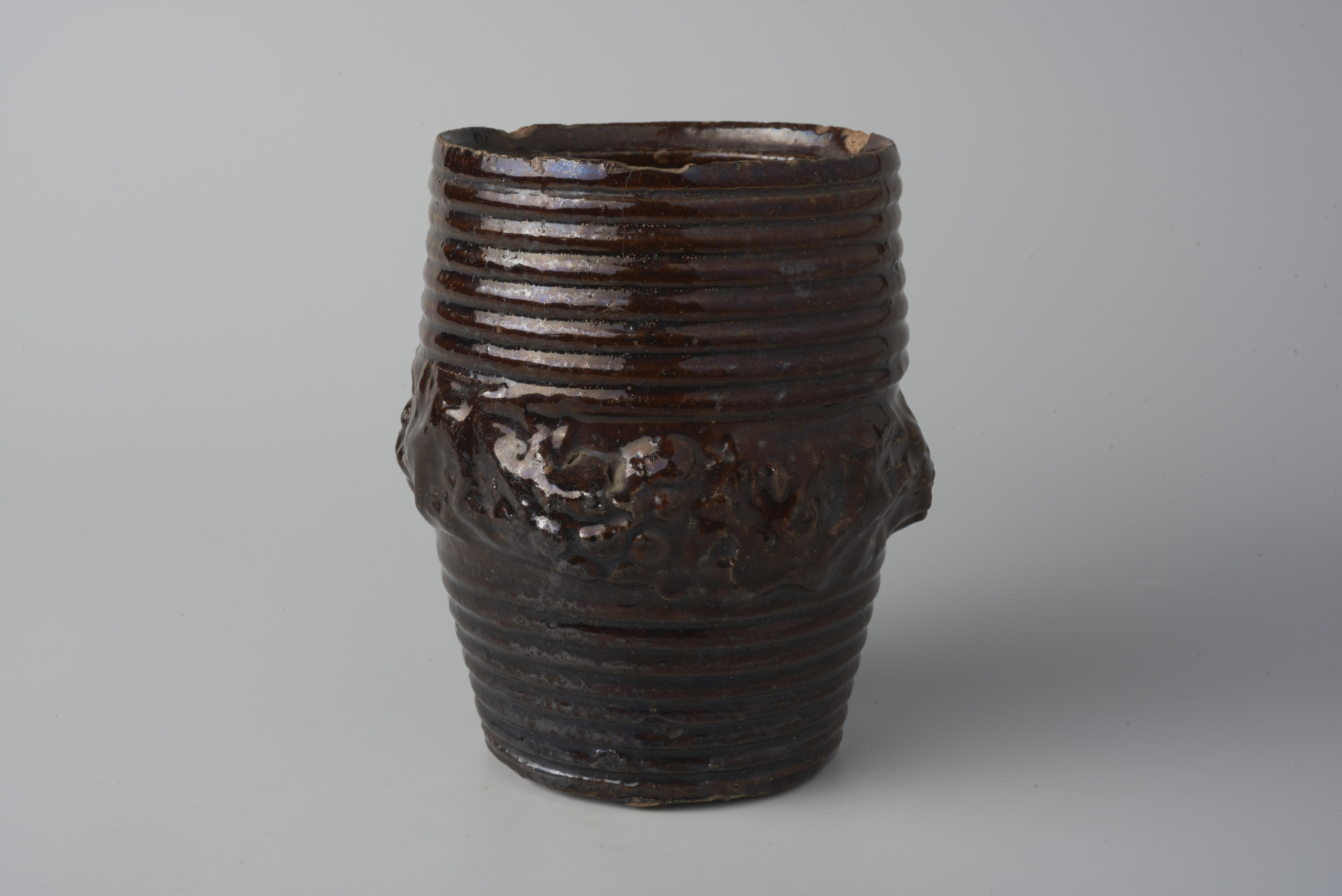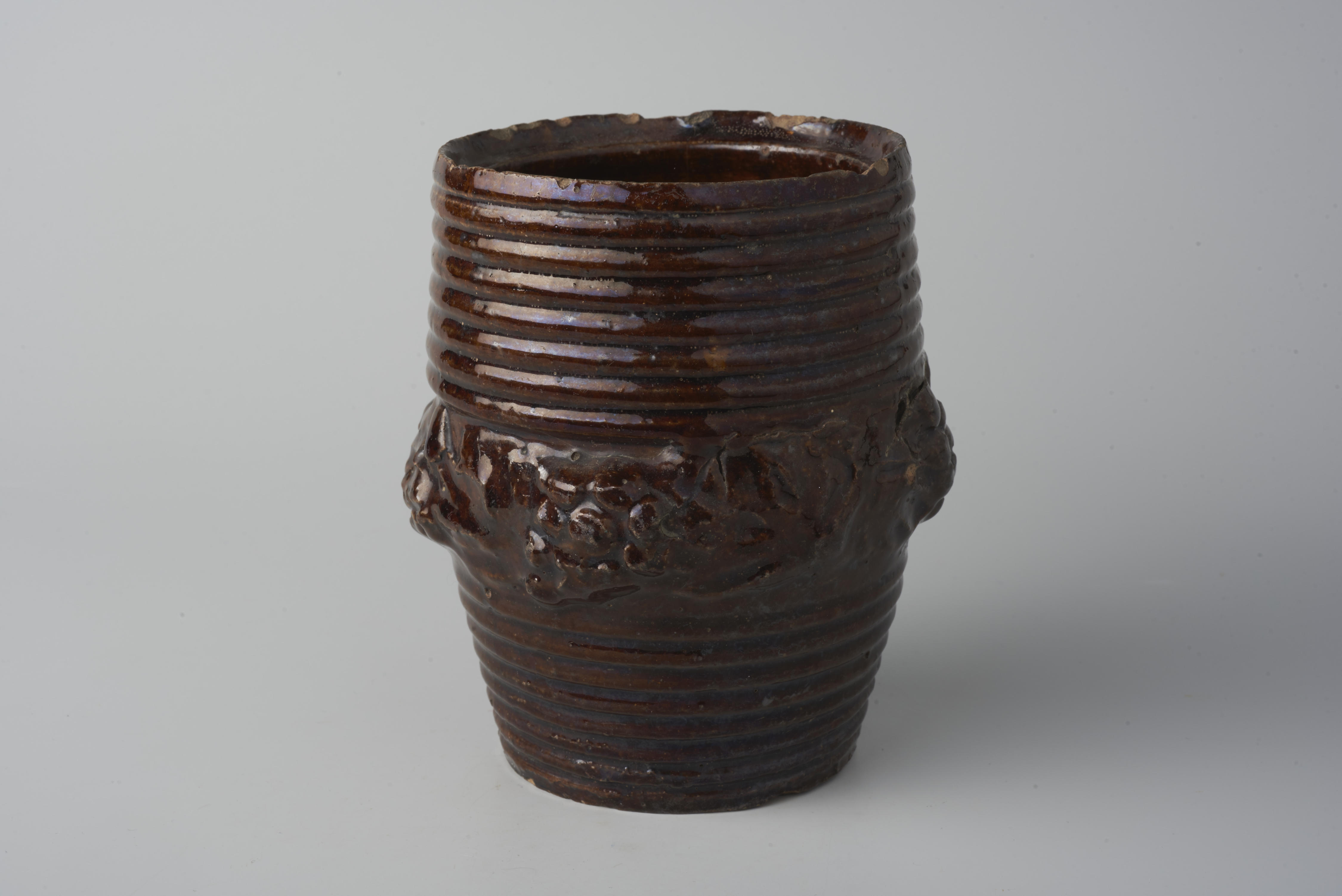 Tabakspot met om het potlichaam een band van plantaardige motieven.