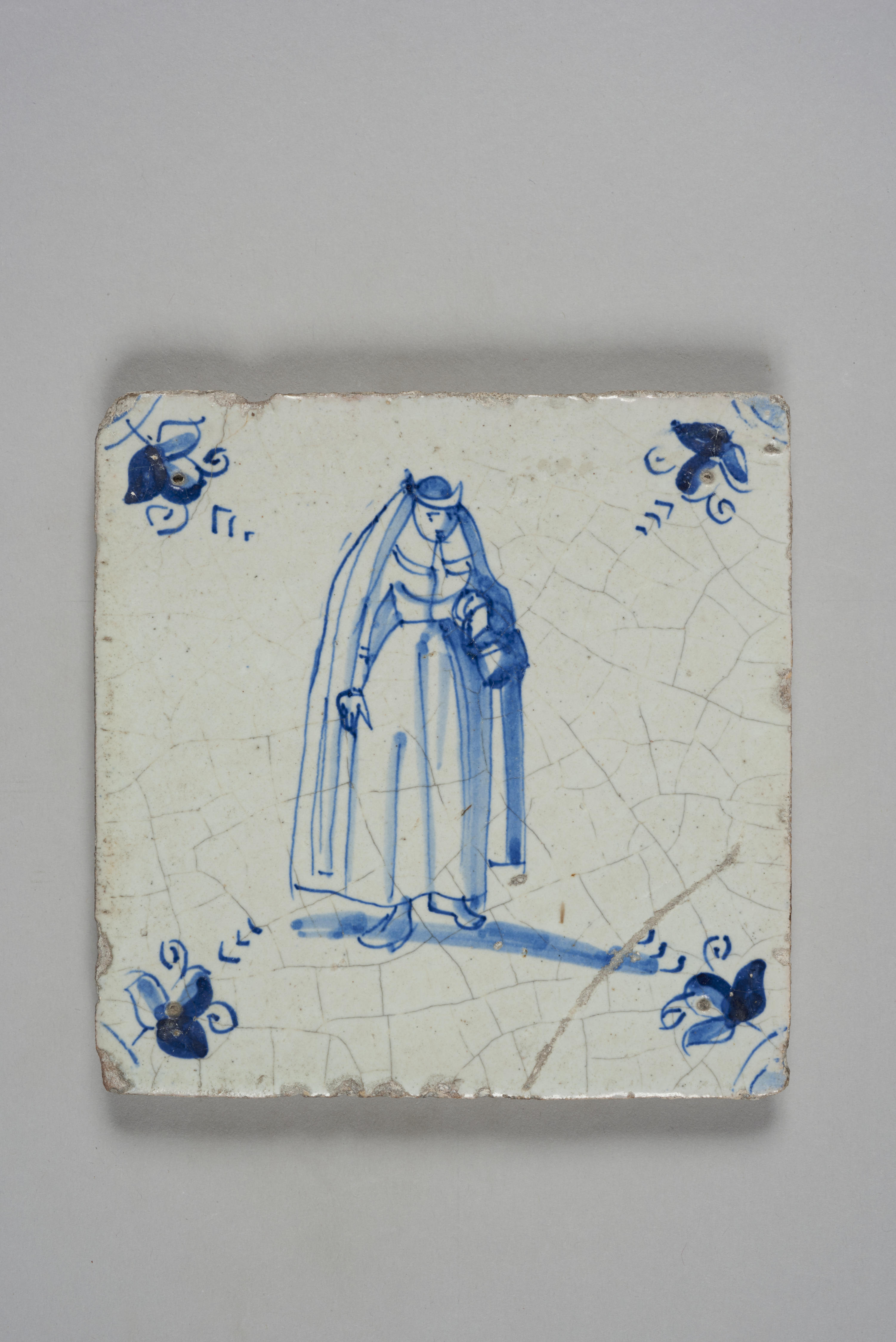 Wandtegel met afbeelding vrouw met huik, 1600–1700