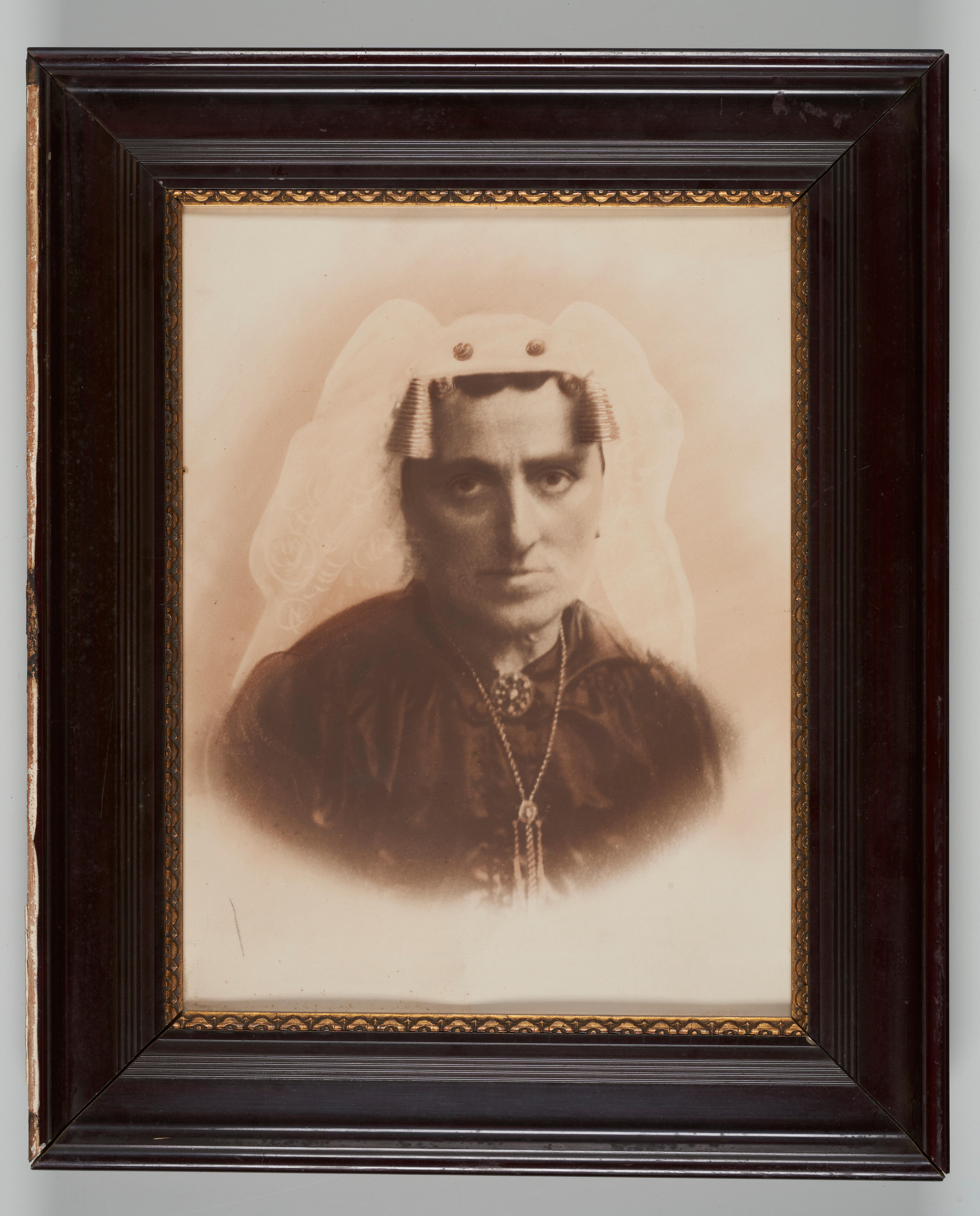 Ingelijste portretfoto van een vrouw uit Klaaswaal, gekleed in de streekdracht van Beijerland en de Hoekse Waard. Ze draagt een sluiermuts of zogenoemde keuvel. In de muts is een oorijzer gespeld met twee kegelvormige uiteinden. Aan weerzijden van deze oorijzeruiteinden is een paar kapspelden te zien. Boven op de sluiermuts is een paar sierspelden in ...
