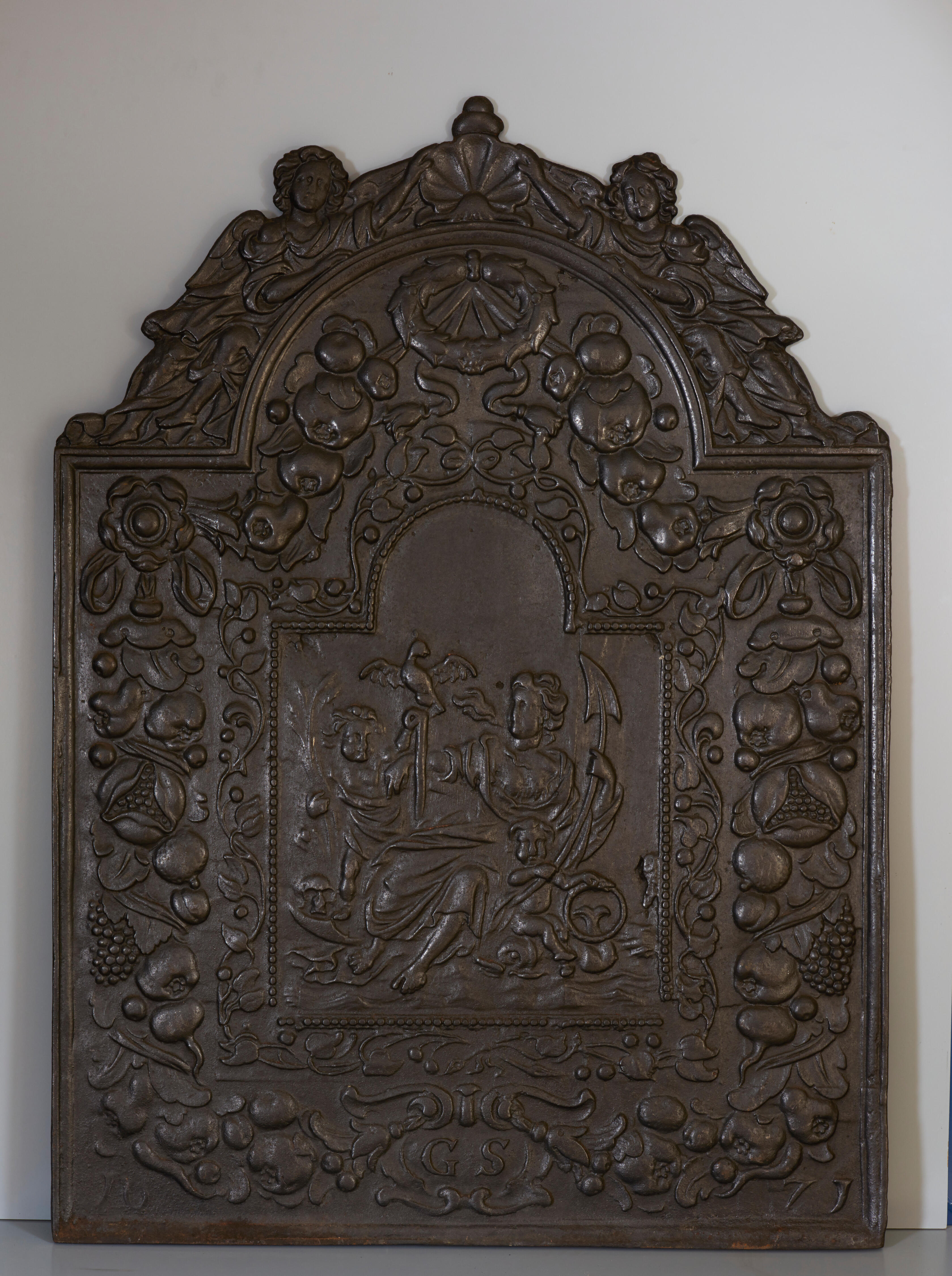 Gietijzeren haardplaat met accoladeachtig bovenstuk. In het midden is een voorstelling aangebracht van een zittende vrouw met twee kinderen en een duif. Boven de voorstelling zijn twee engelfiguren afgebeeld. Verder is de haardplaat verfraaid met allerlei vruchten. In de zeventiende eeuw brandde het vuur in de schouw op een stenen vloertje. De achterwand van de ...