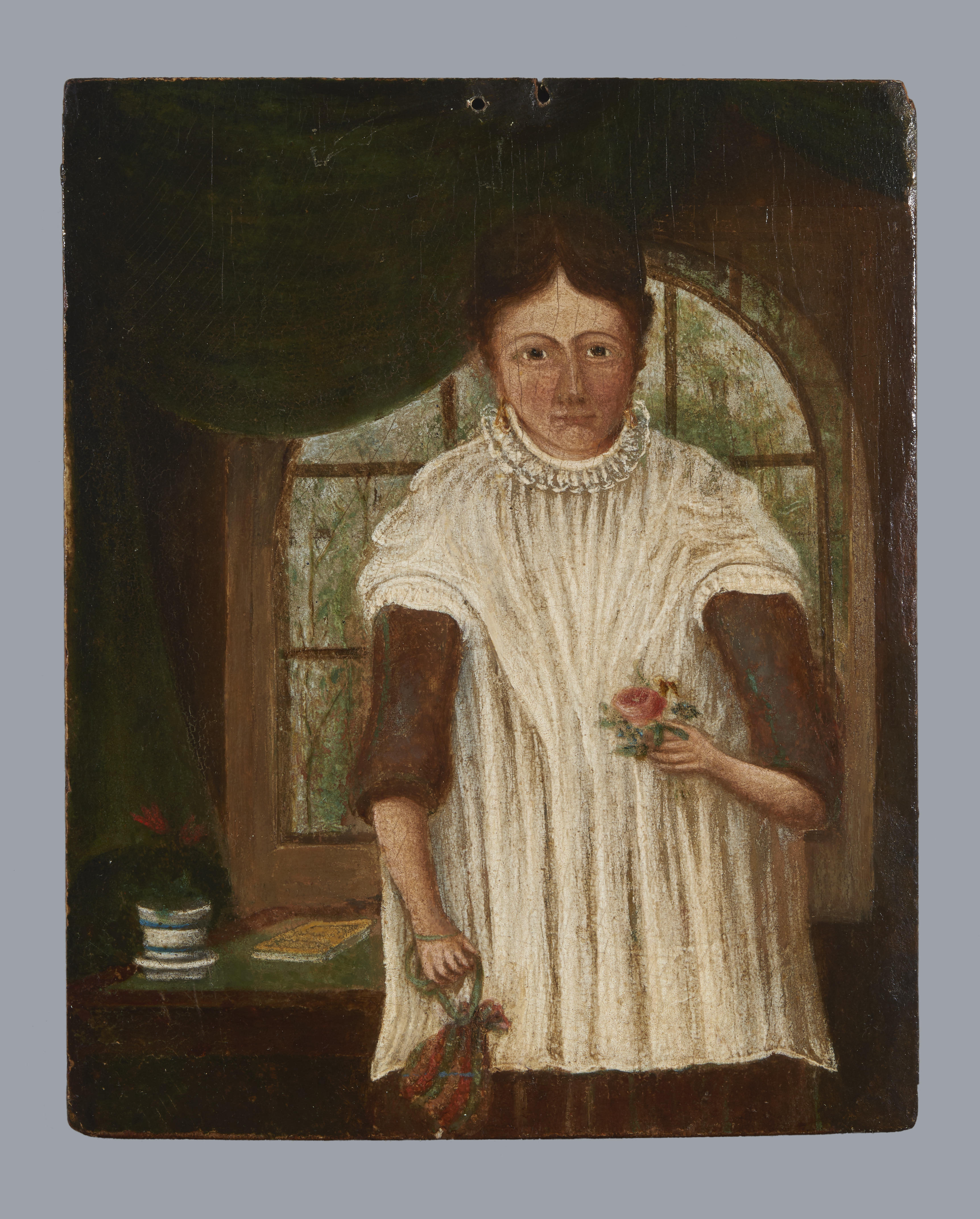 Olieverfschilderij op een eikenhouten paneel van een vrouw voor een raam. De vrouw heeft een roos in de ene en een tas in de andere hand. De vroeg twintigste-eeuwse beschildering is aangebracht op een paneel uit de negentiende eeuw.